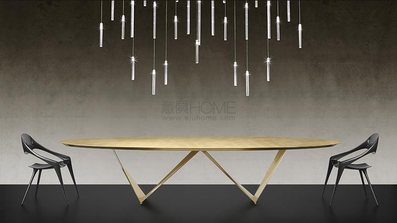 Dining table. Metal bases in Grafite, scratchy steel or in satin brass or titanium finishing. Top in tempered 15mm thick transparent glass.