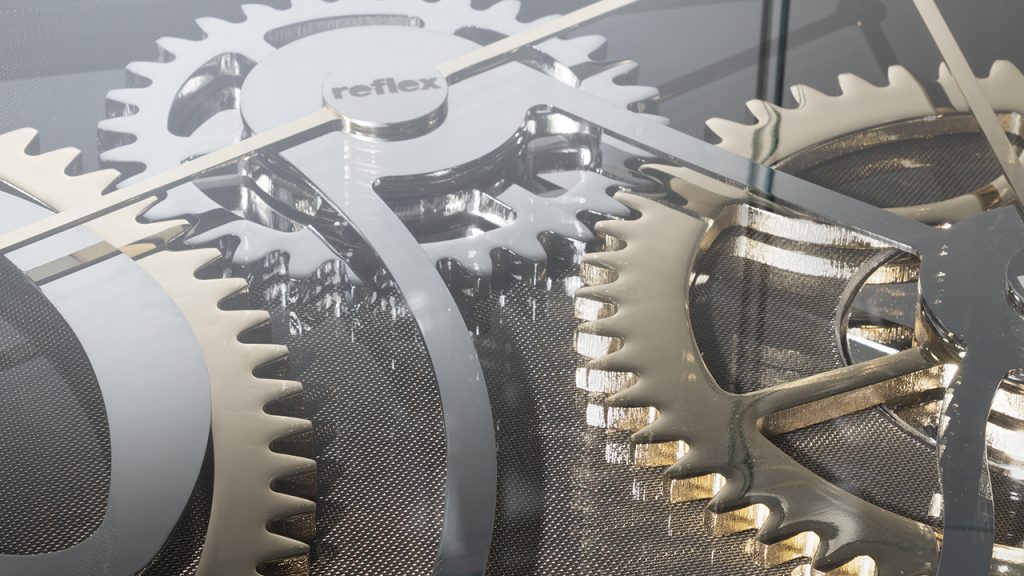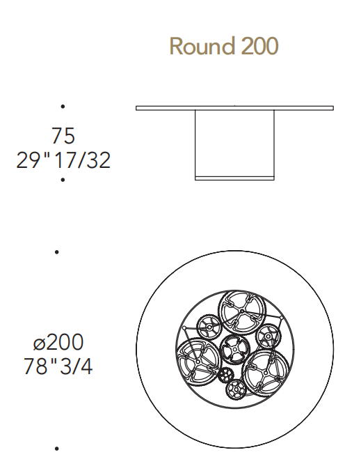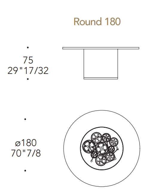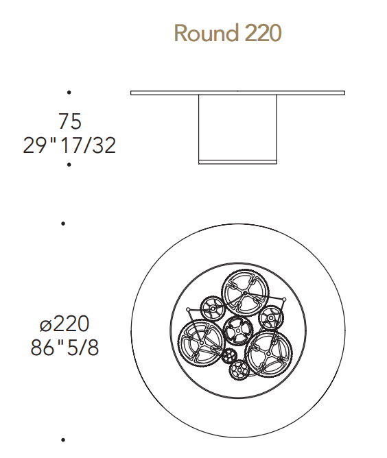 Tavolo pranzo con base a 1 cilindro rivestito in pelle CAT.C o NABUK con trapuntatura. Piano in legno sp.40mm con cover in Marmoreflex/Legnoreflex. Bordo del top e base del cilindro nelle finiture metalliche (Bronze (100M), ottone (104), ottone dark (105M9, titanium (101M), rame (107M), oro (103M)). Lazy Susan integrato in vetro trasparente con ingranaggi in oro e cromo lucido su fondo in vetro Mesh.
