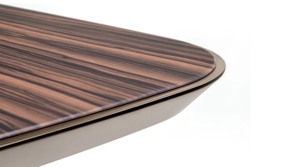Tavolo da pranzo con base in vetro, vetro bronzo o fumè con incisioni London. Top con Bevel Wood in Noce Canaletto o in Canaletto Hennè.