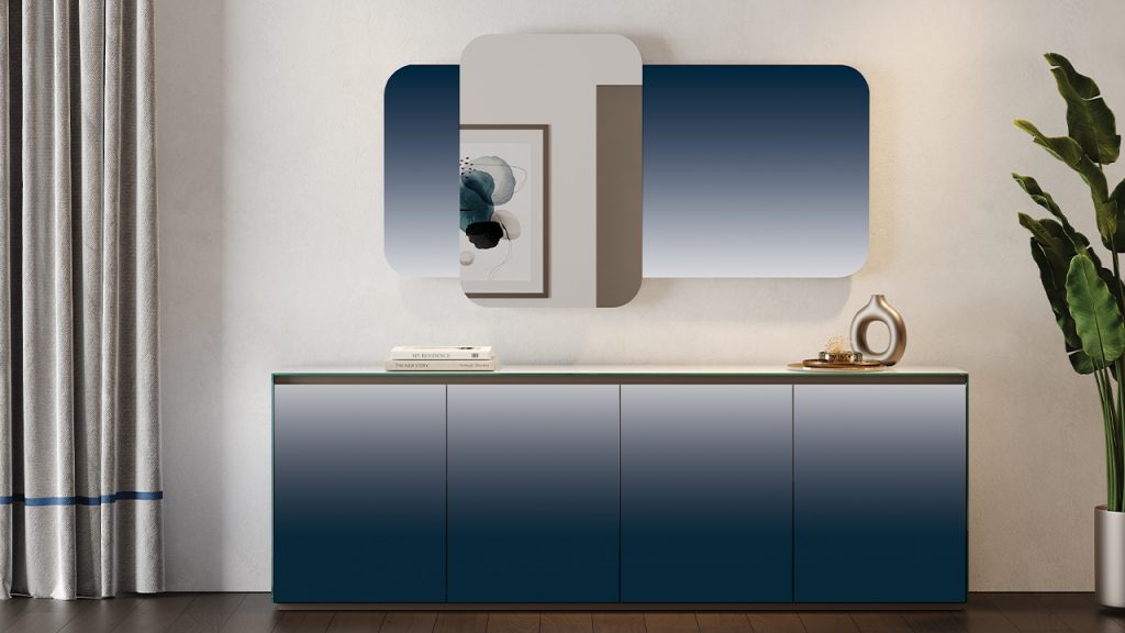 Pannello rettangolare con angoli arrotondati in Vetro Sfumato. Specchio scorrevole in vetro extrachiaro sp.5mm.