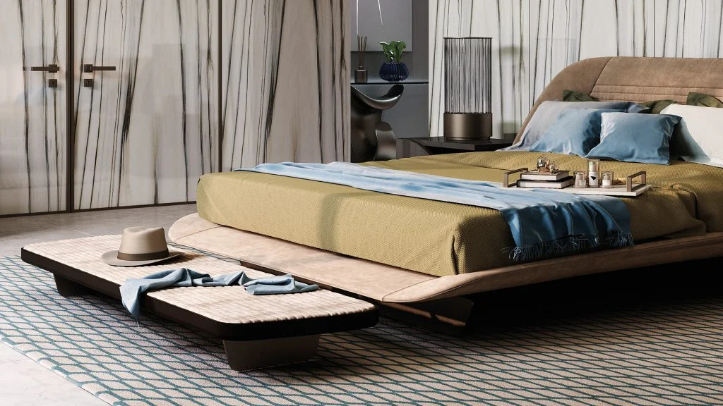 Pouf con piano in Rovere Henné, Miele, Beluga, Noce Canaletto, finitura satinata ottone (104M), ottone dark (105M), titanium (101M).