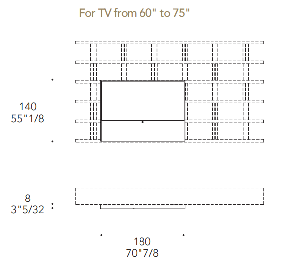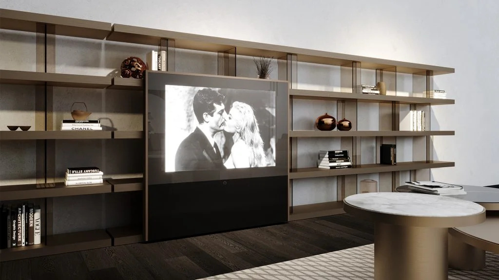 Libreria modulare a incastro con divisori in vetro fumé o vetro bronzo sp. 10mm e ripiani in legno in finitura Bronze o in finitura metallica satinata. Anta scorrevole porta TV in vetro Dark Grey. Cornice in metallo in bronze (100M). Fascia per speaker in lycra nera