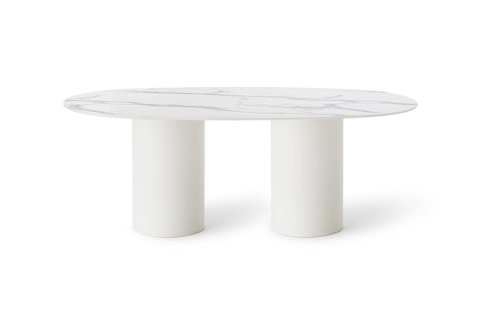 Tavolo ovale con base in lamiera di acciaio inox Aisi 304 verniciato a polveri, top in HPL. Dal design minimalista e moderno, questo tavolo dalle dimensioni generose, si caratterizza per il doppio basamento cilindrico che lo rende protagonista del vostro living, grazie alla forte espressione dei suoi materiali.