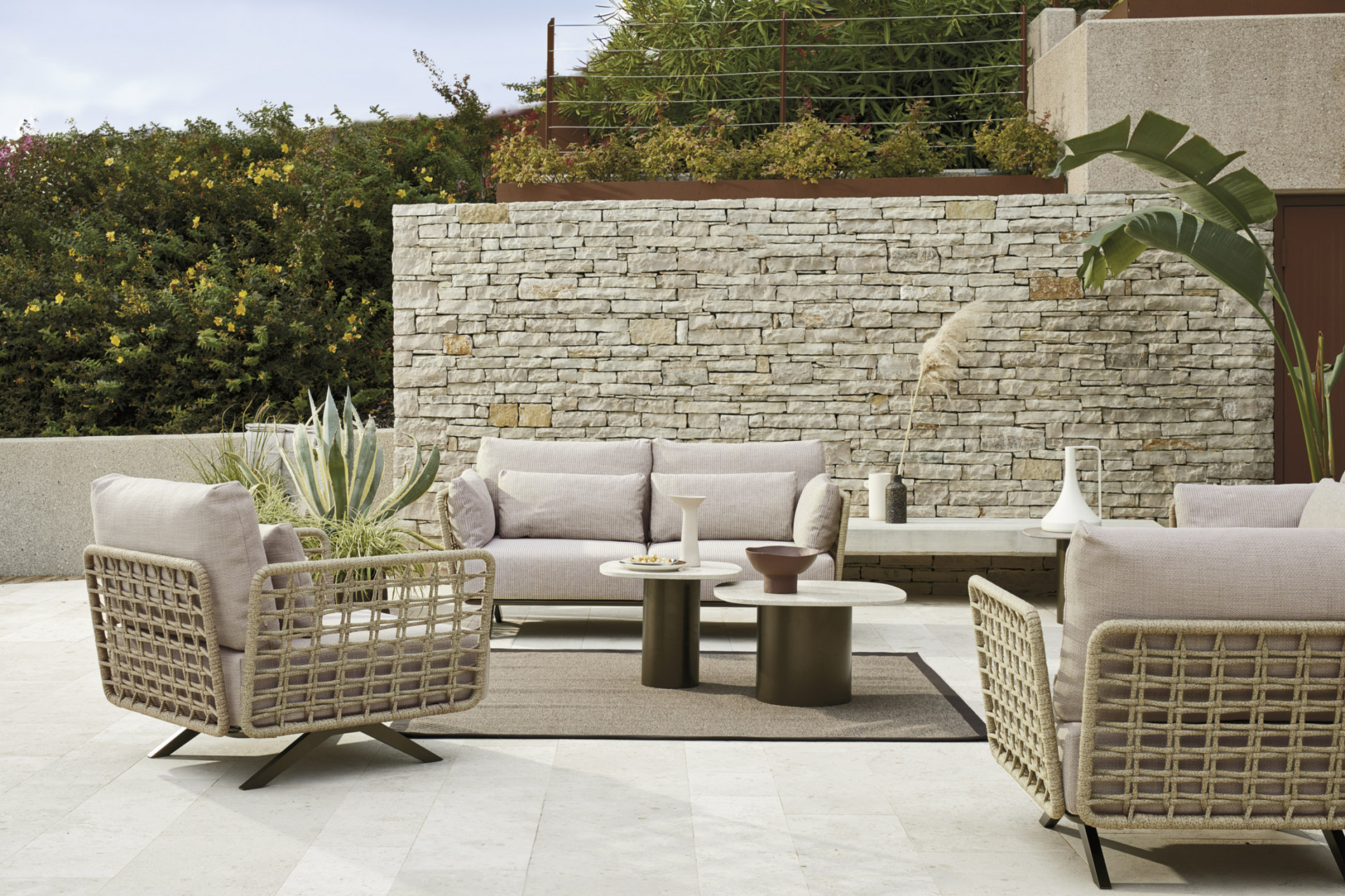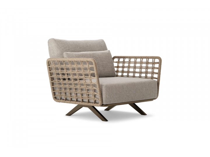 Poltrona in acciaio inox Aisi 304 ed alluminio, verniciata a polveri ed intrecciata in Oval Trendyrope. Linee che valorizzano l'iconico stile italiano, dove le lavorazioni in corda donano un'estetica materica ed artigianale alla morbidezza avvolgente delle sedute, per concepire uno spazio ideale, dedicato al relax e alla socializzazione. Progettata sia per l'arredamento residenziale che contract, outdoor e indoor.