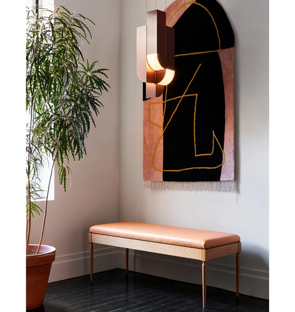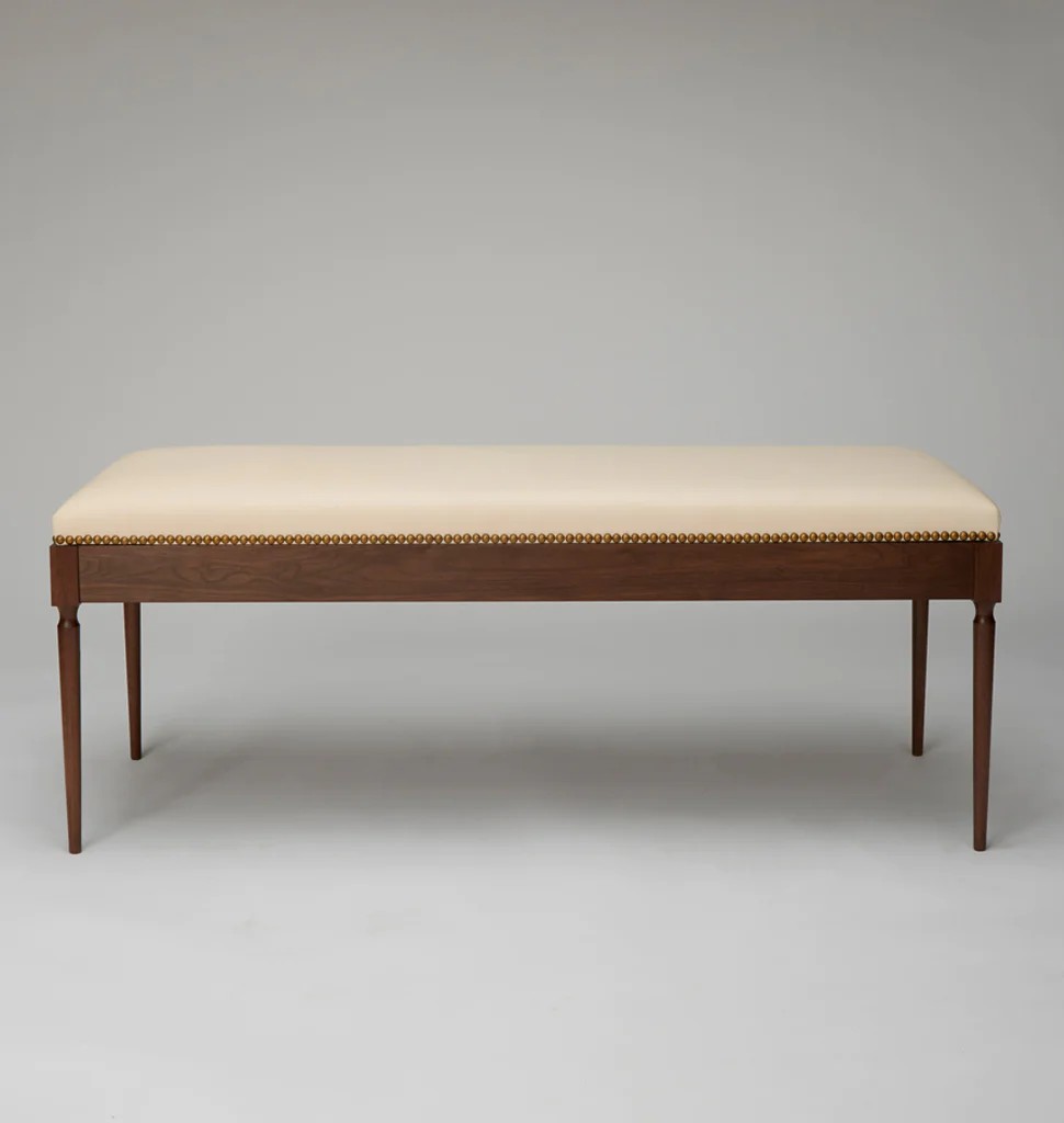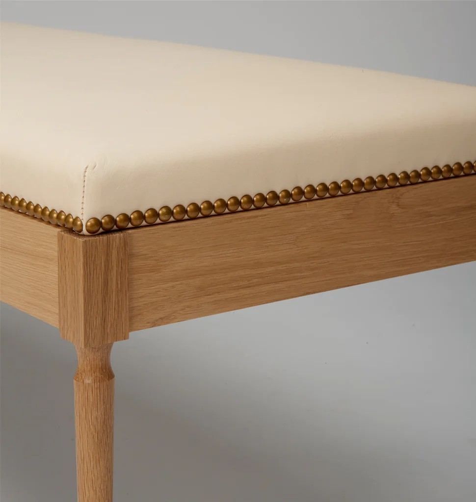 Like The Cain tables, The Judy employs classic detailing in a ghost-like form. The legs are as delicate as possible and lend a sense of weightlessness to the piece. The seat is made of natural, undyed leather, which will patina over time.