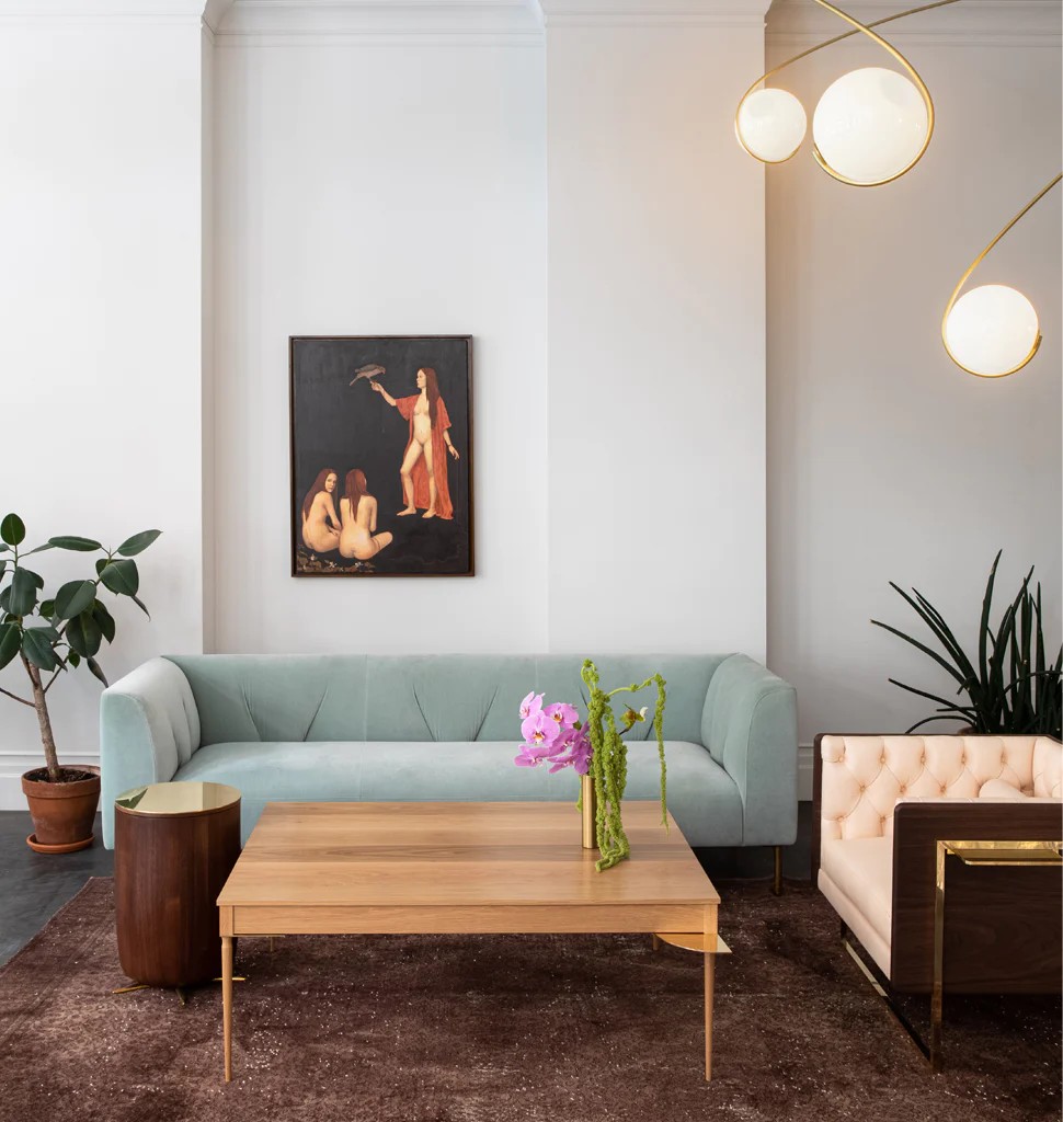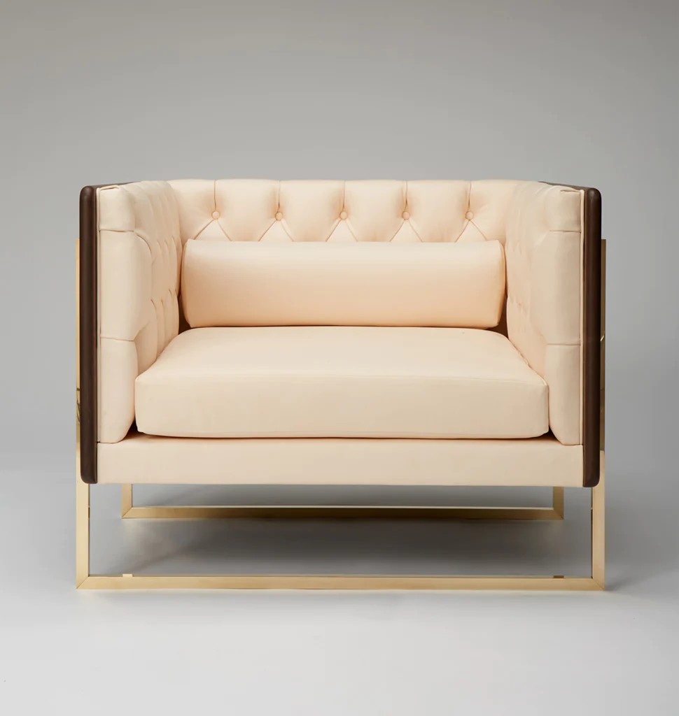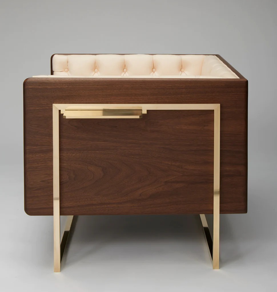 Taking its cue from the traditional club chair, The Lair has a squared-off and simplified silhouette that makes it seem muscular and delicate. Tucked into its side is a small brass tray that folds out for your glass, your sharpie, or journal.