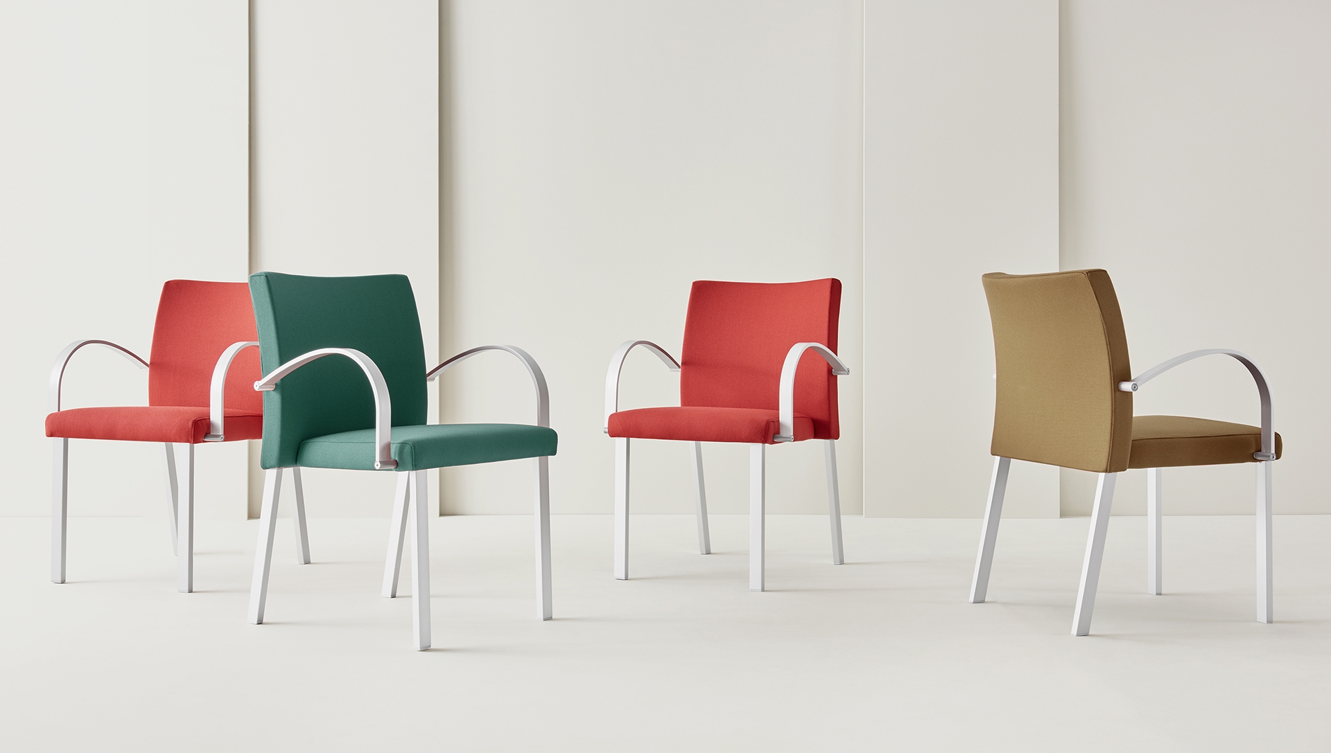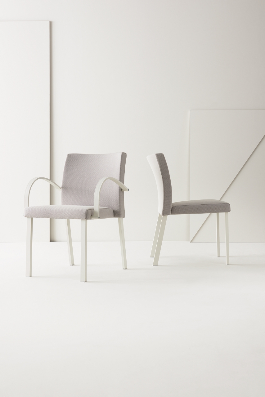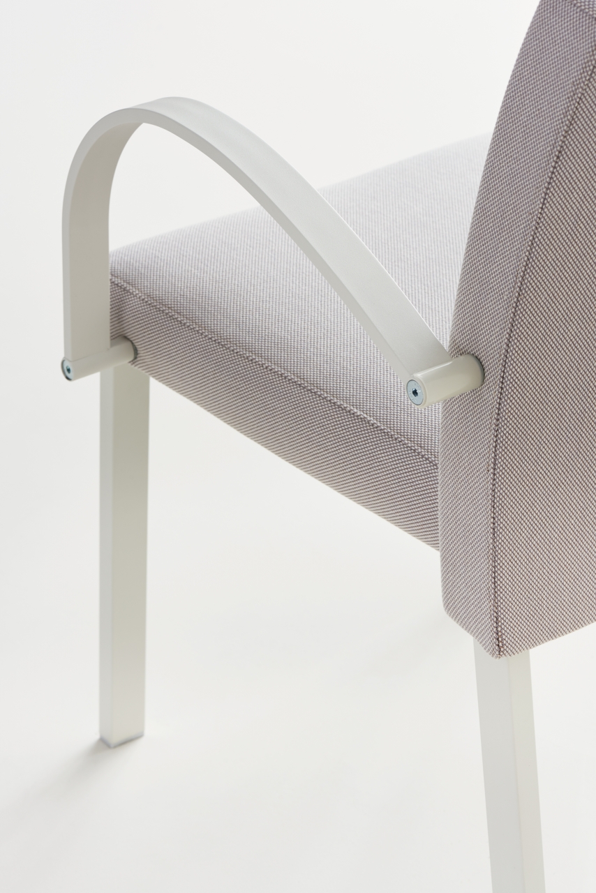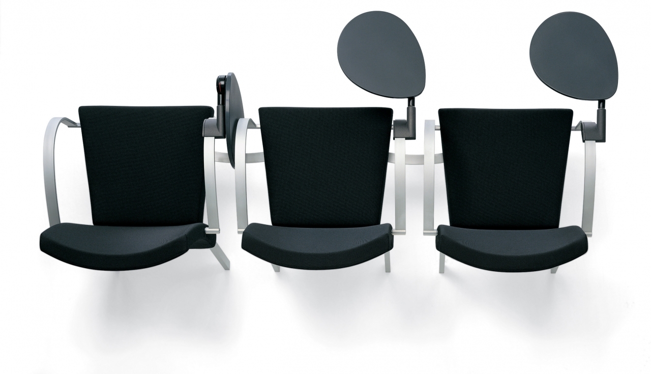 Highly functional stacking chair using rectangular aluminium frame in powder coated or anodized finish with injected polyurethane foam. Uncommon anti-panic writing tablet on.