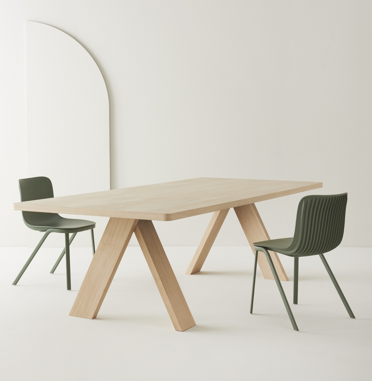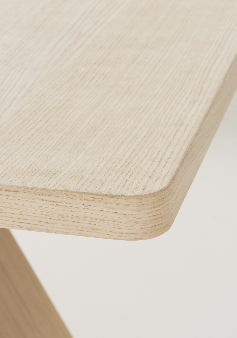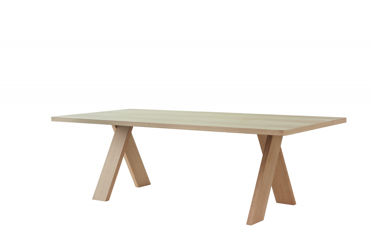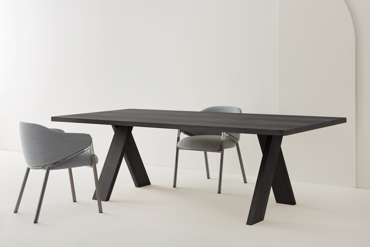 Table with essential and rigorous lines stands out for its original legs composition. These are arranged perpendicularly as well as at an angle, suggesting a circularity that amplifies the overall lightness of the piece. Solid oak available in natural or black aniline stain, Artful is perfect for both corporate meeting spaces and residential living areas.