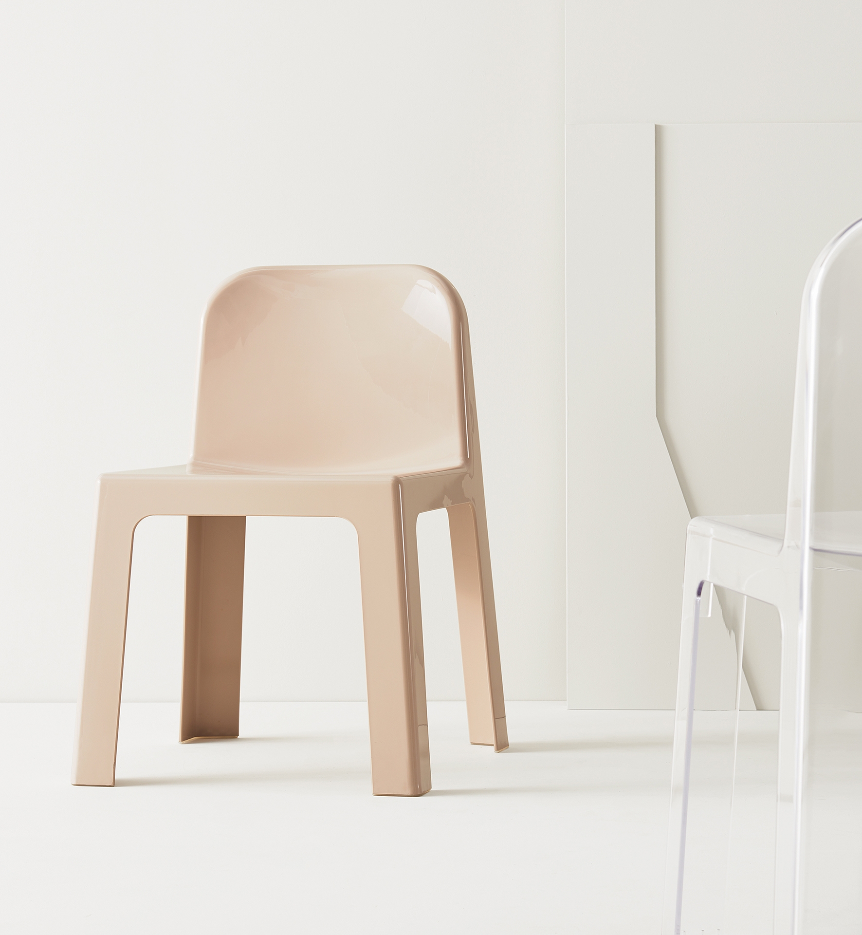 Irony with high thickness One piece, but with a dual use, Trono is a chair with cap/cappuccio, an accessory that transforms it into an armchair. Born from a project of Sottsass Associati Design, it has an ironic design and a resistant structure. Made from a single injection of various technopolymers with a strong thickness, is suitable even for the most exciting situations. Trono is stackable, up to fifteen pieces, of the same material. Available in nylon, solid colour or in polycarbonate, transparent. Two the colours for the Cappuccio with a textured finish.