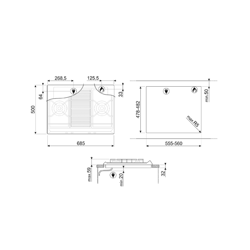 Classic/ 經(jīng)典系列,70cm 嵌入式 2 眼燃氣灶具,1 級能效,拉絲不銹鋼,鑄鐵鍋架,全銅爐頭組件