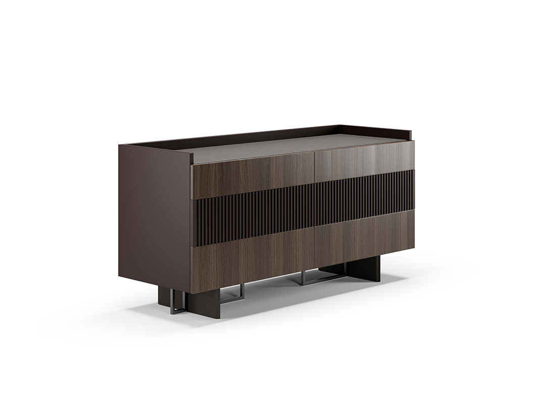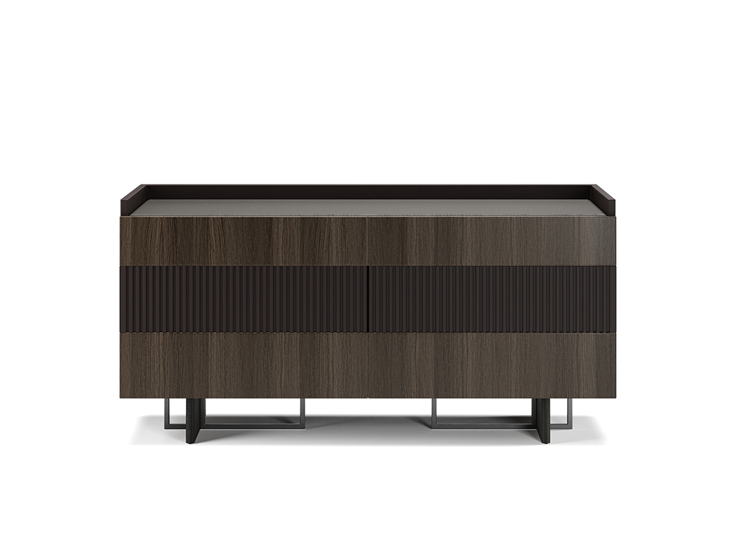 MOBILE CONTENITORE TRE CASSETTI CON VANO A VISTA, GAMBA CON TELAIO IN METALLO E PANNELLO IN PELLE