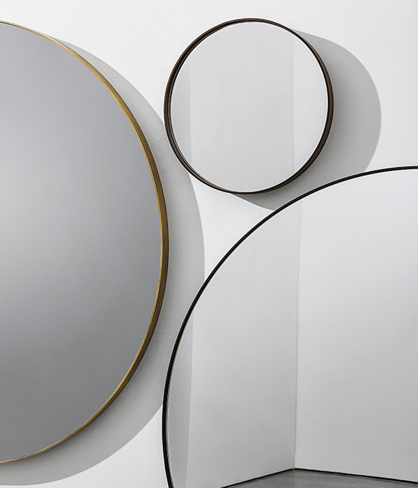 Specchiera rotonda con telaio in metallo laccato nelle finiture ottone brunito o caffé.