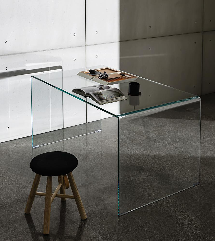 Tavolo / scrivania in vetro curvato trasparente extrachiaro o laccato mono o bicolore, vari colori.