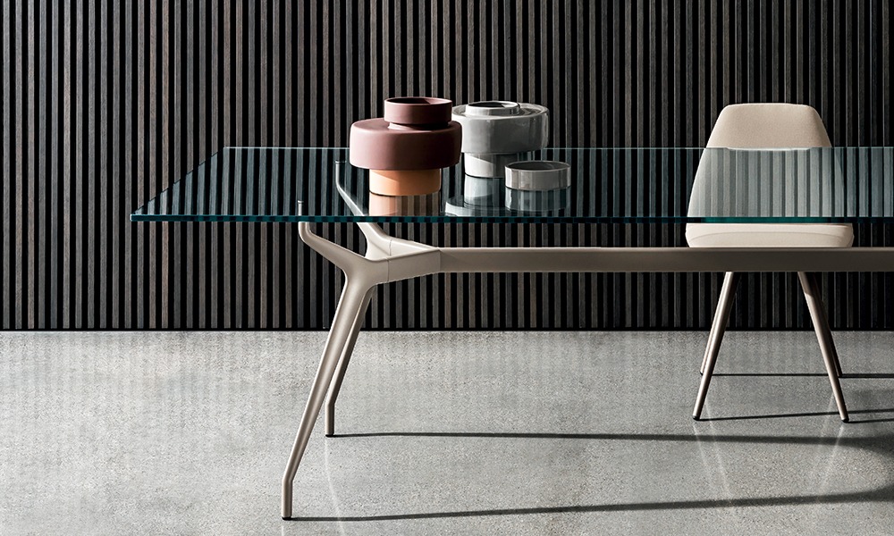 Tavolo con gambe e struttura in alluminio, varie finiture. Top disponibile in varie misure, materiali e finiture.