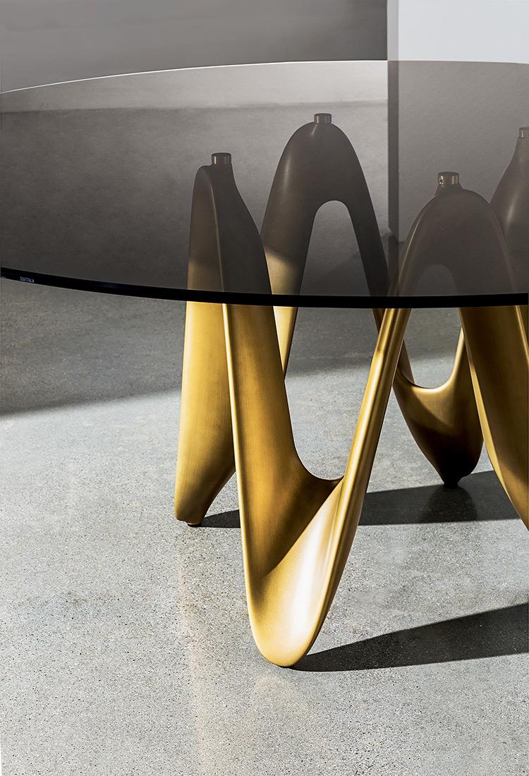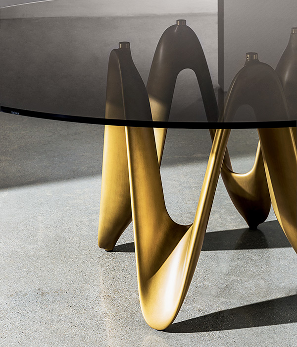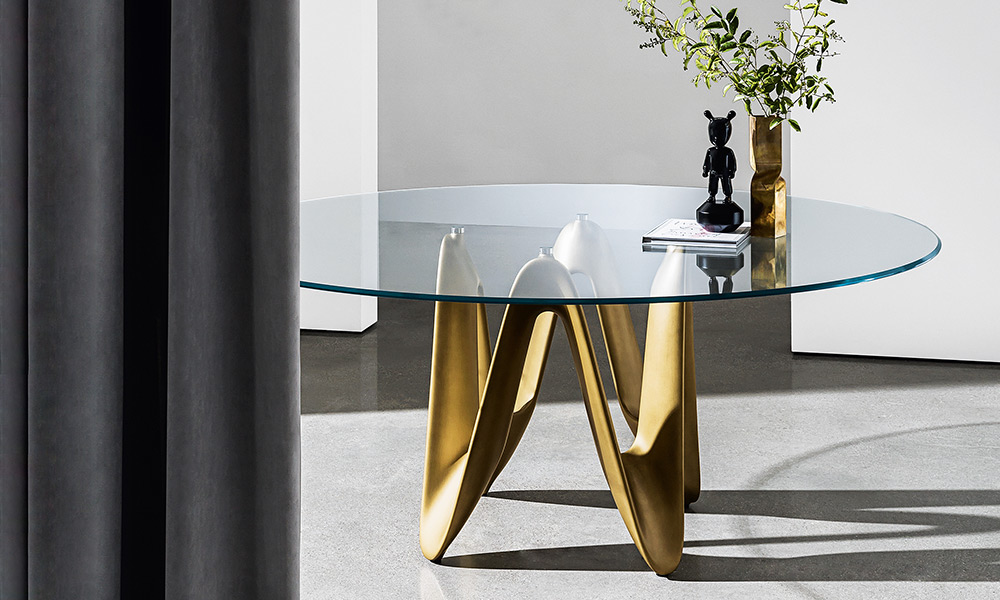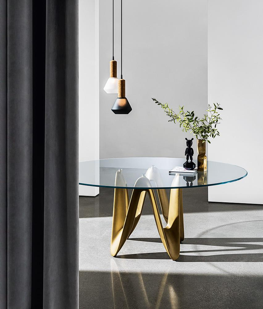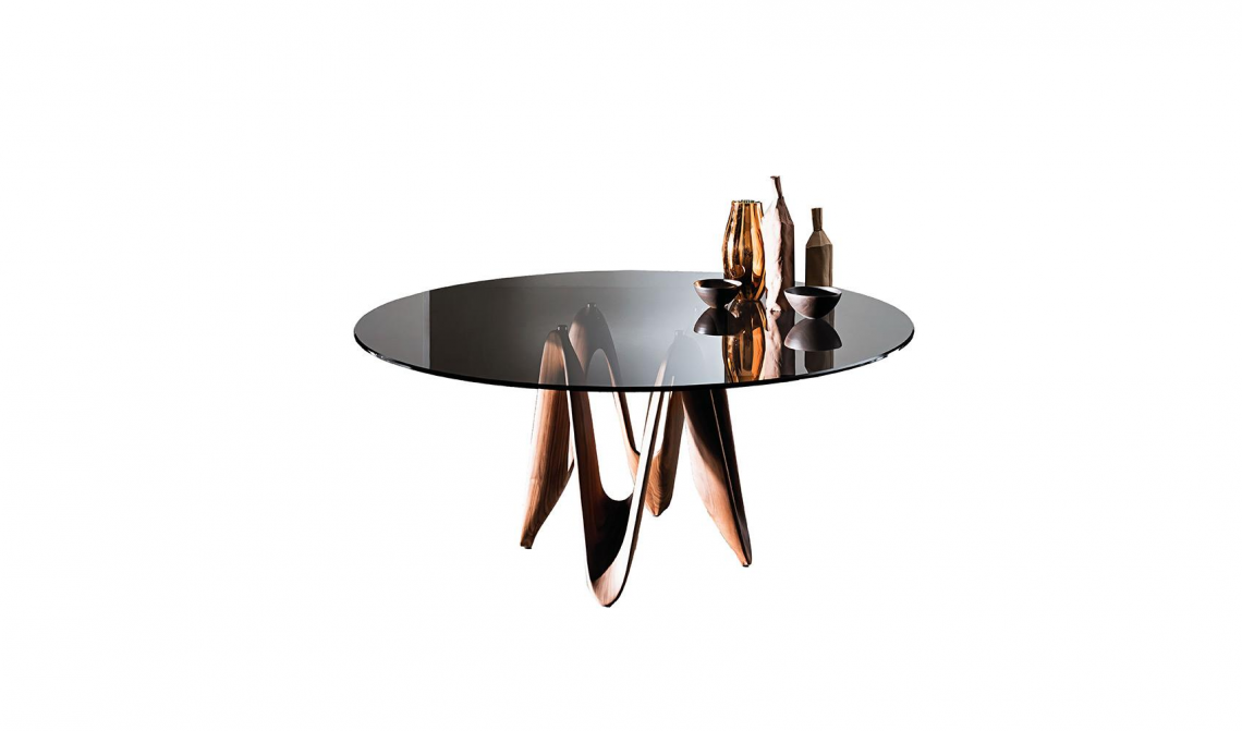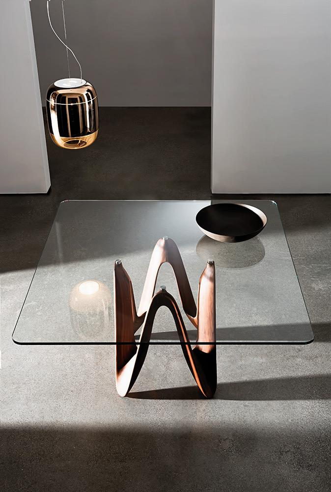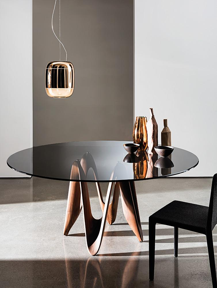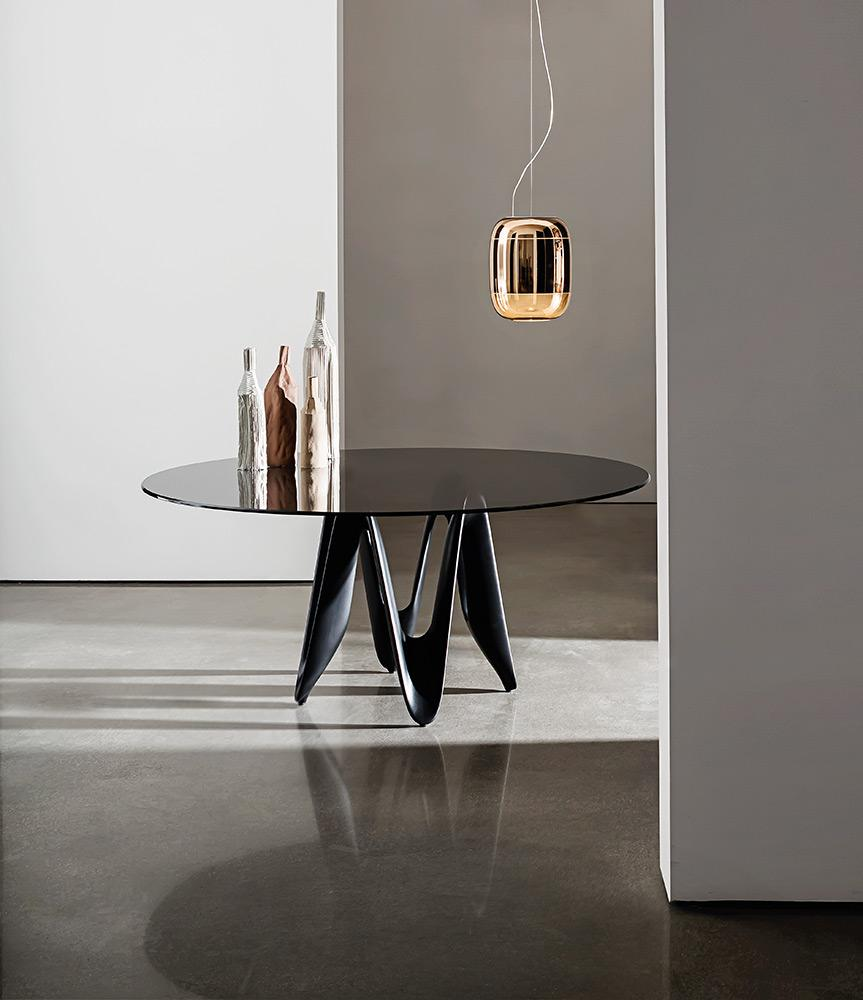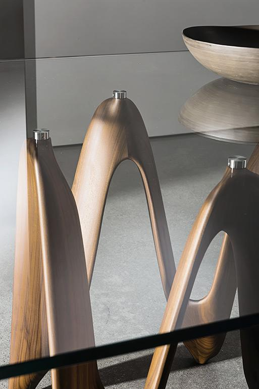 Tavolo con base in cristalplant bianco opaco, nero, brunito. Disponibile anche in legno di frassino con finitura tinto rovere o wengé, o in legno massello noce canaletto. Top in vetro temperato trasparente extrachiaro o fumé, o in ceramica, varie finiture. Piano disponibile anche nell’esclusiva finitura Liquid glass.