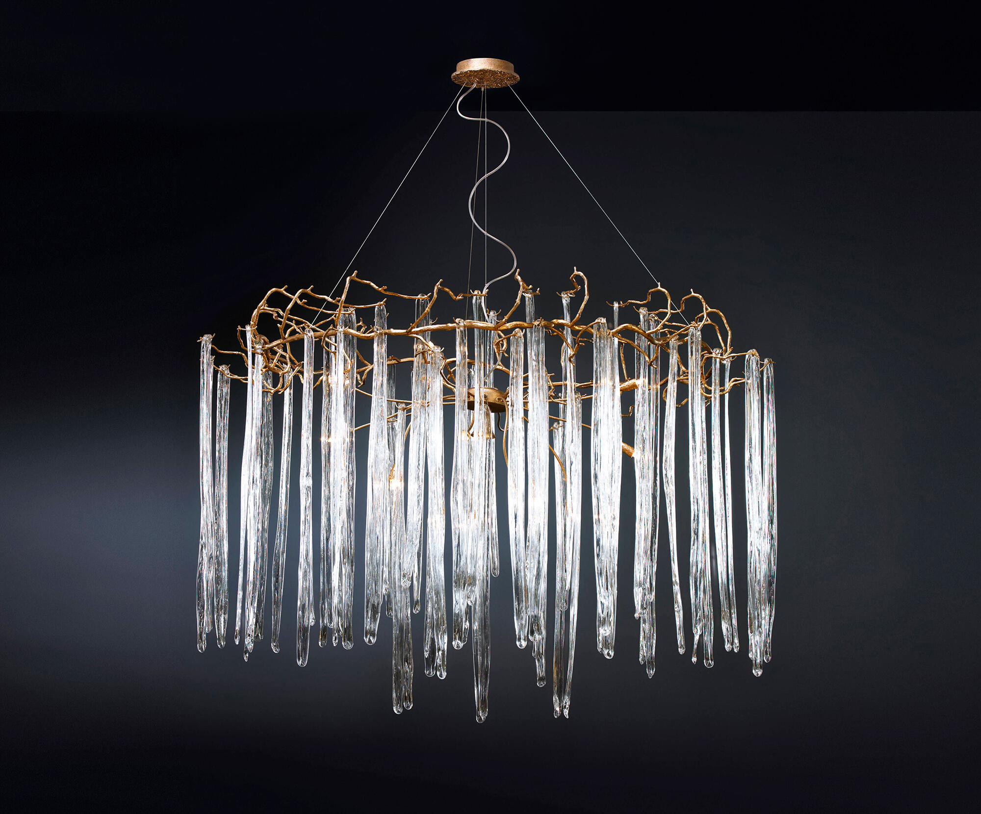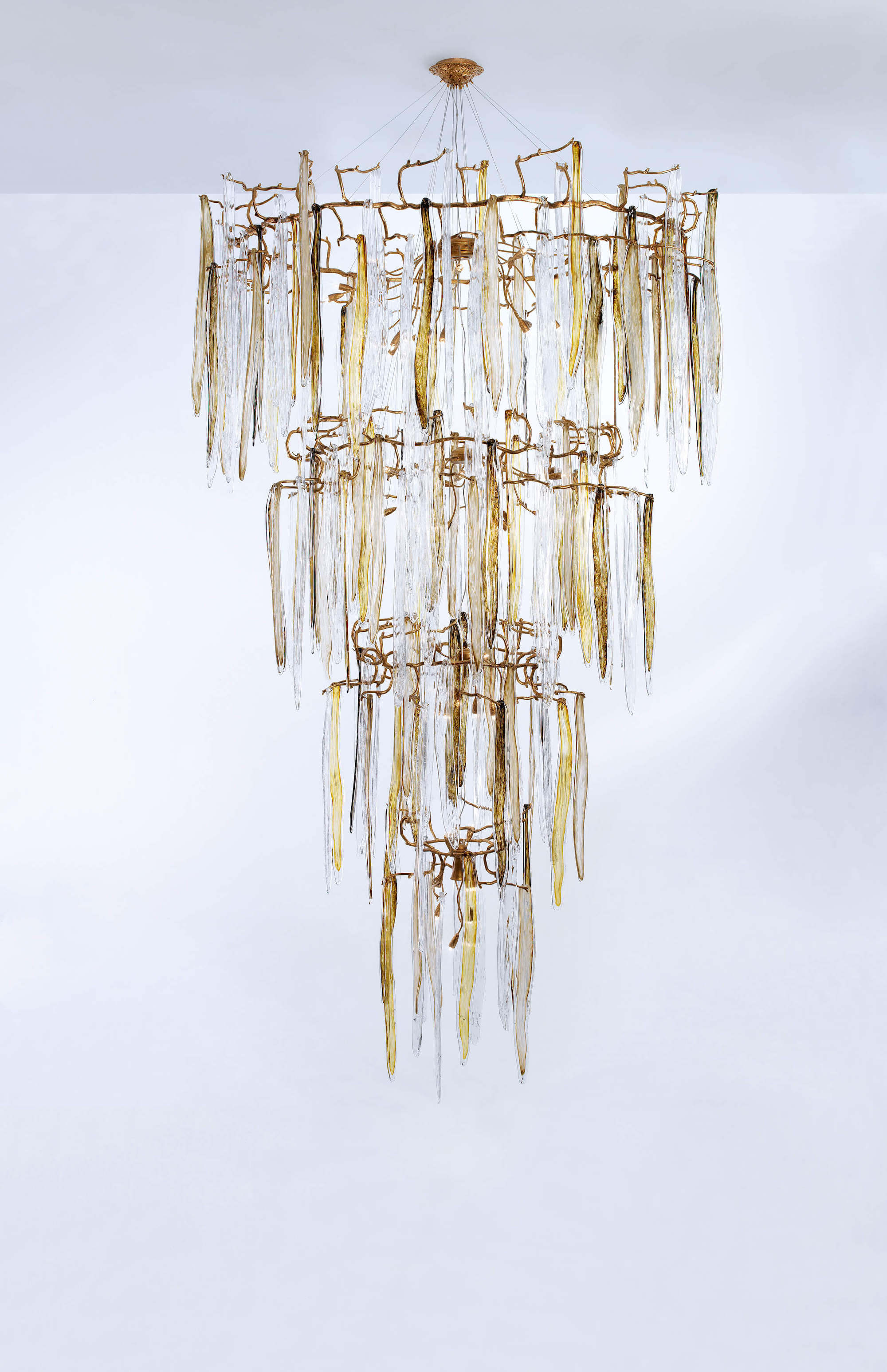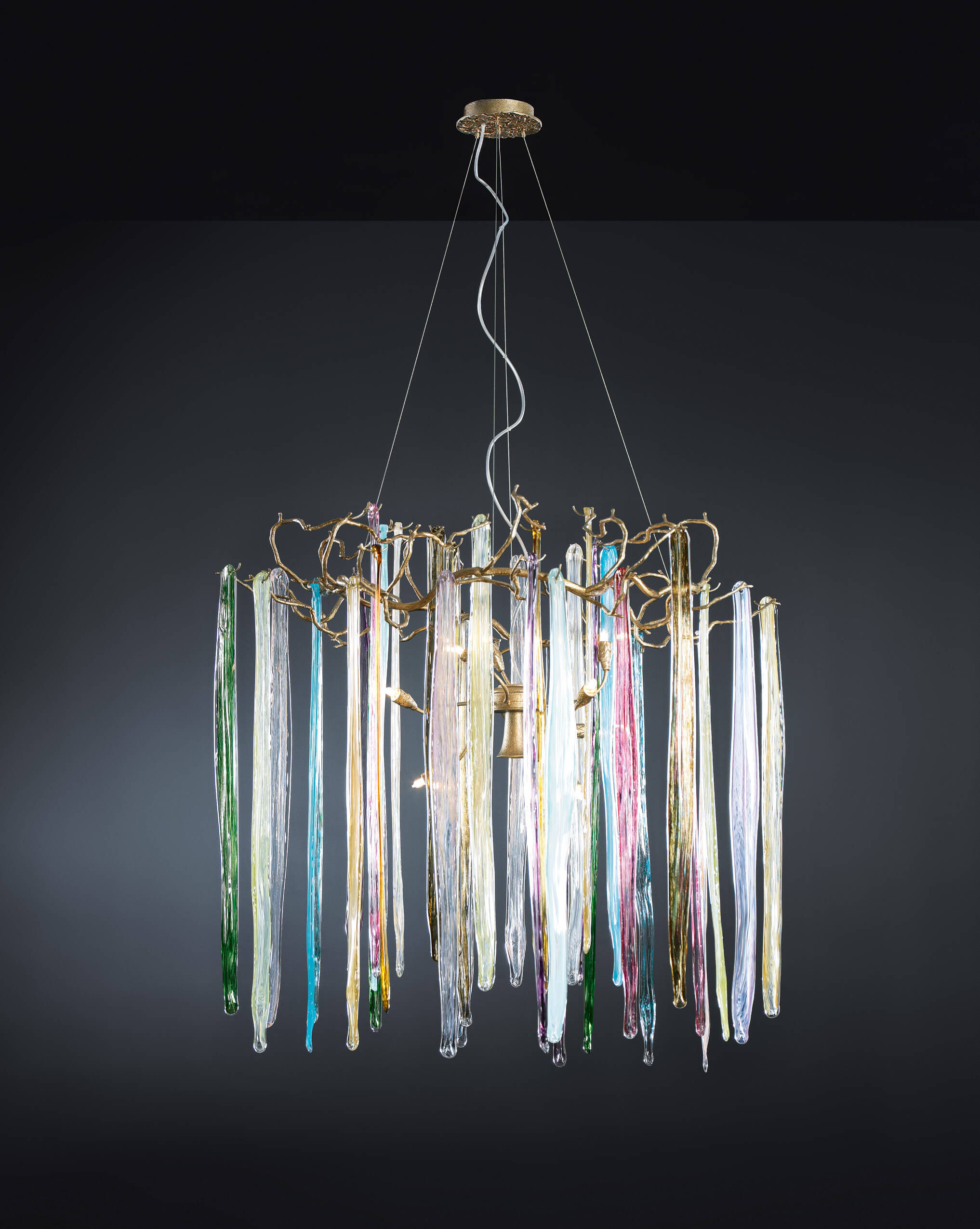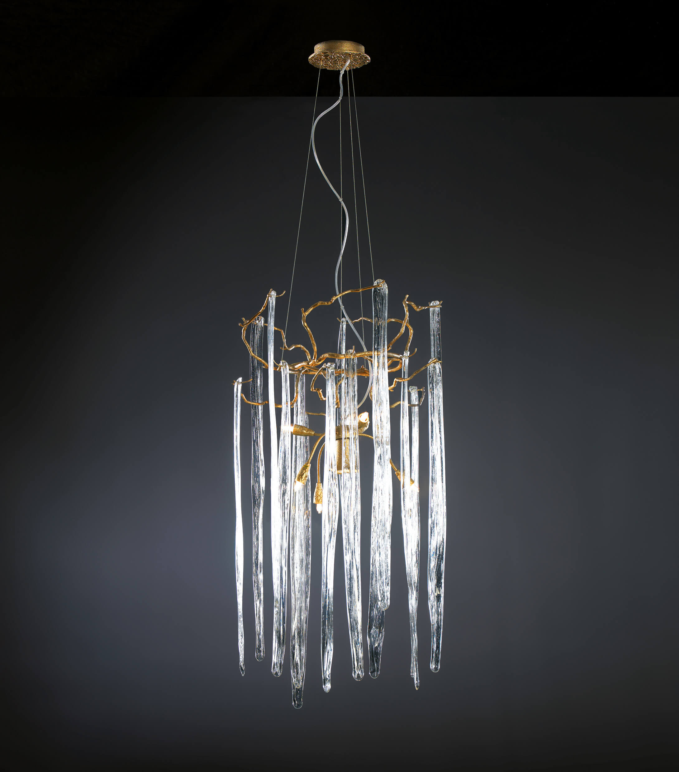 Featuring intrinsic solid verticality, the Waterfall collection plays with the duality of visually dense crystal pieces and the minimalism of the bronze structure. Impending water fractions suspended and immobilized, the glass of the Waterfall exist in an extended diversity of chromatic options, a characteristic that combined with the different bronze finishes, meets the need to combine with decoration elements of various shades in a grandiose visual presence.