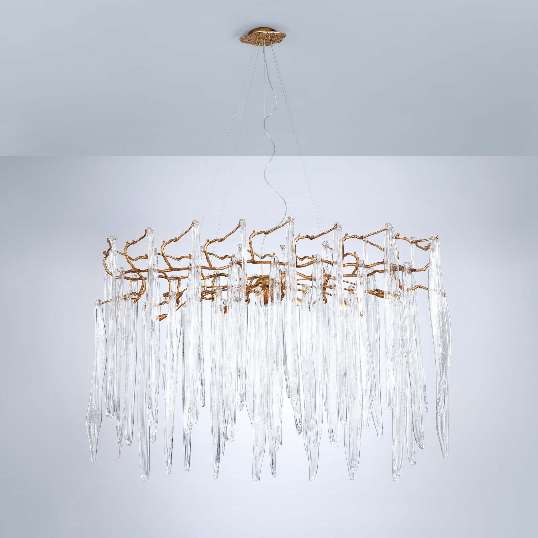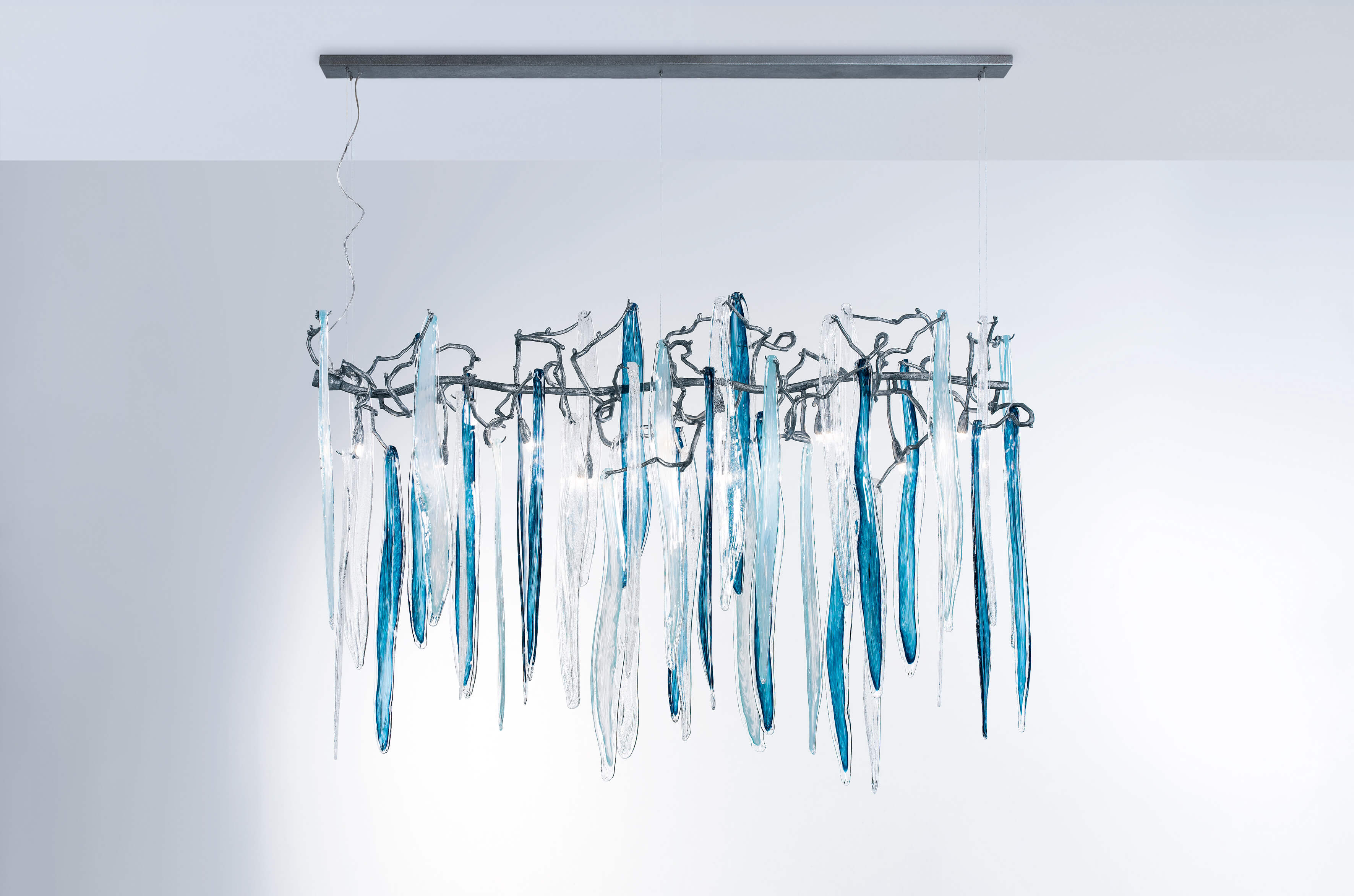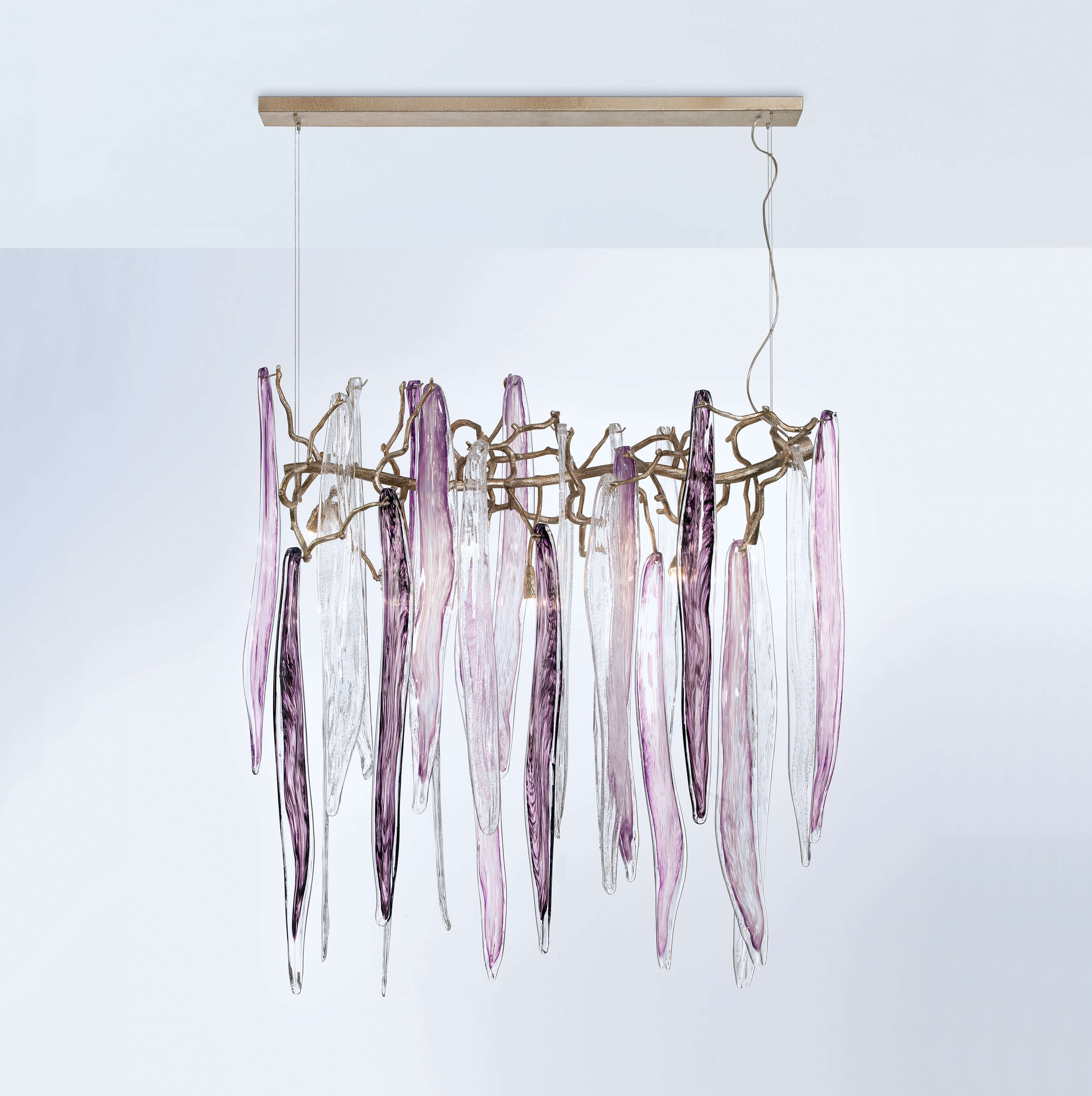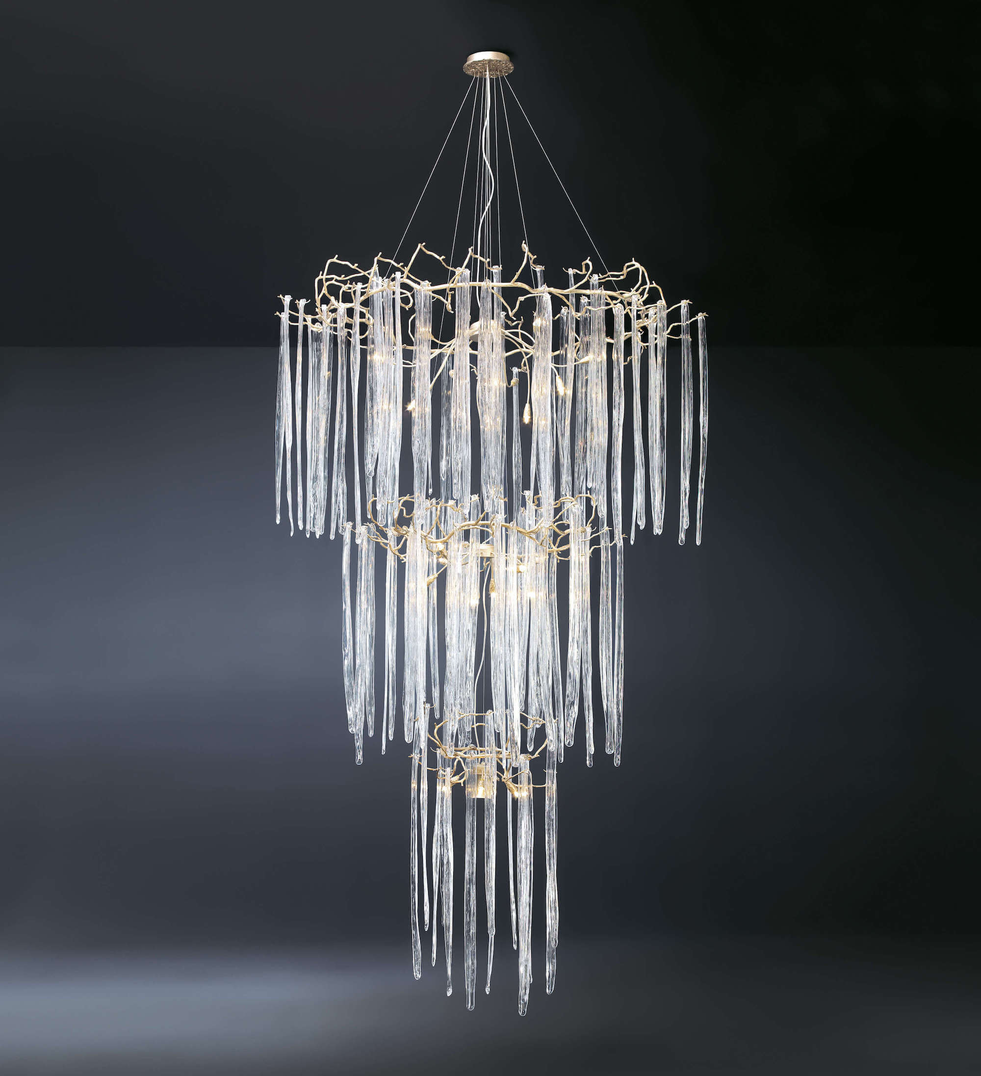 Featuring intrinsic solid verticality, the Waterfall collection plays with the duality of visually dense crystal pieces and the minimalism of the bronze structure. Impending water fractions suspended and immobilized, the glass of the Waterfall exist in an extended diversity of chromatic options, a characteristic that combined with the different bronze finishes, meets the need to combine with decoration elements of various shades in a grandiose visual presence.