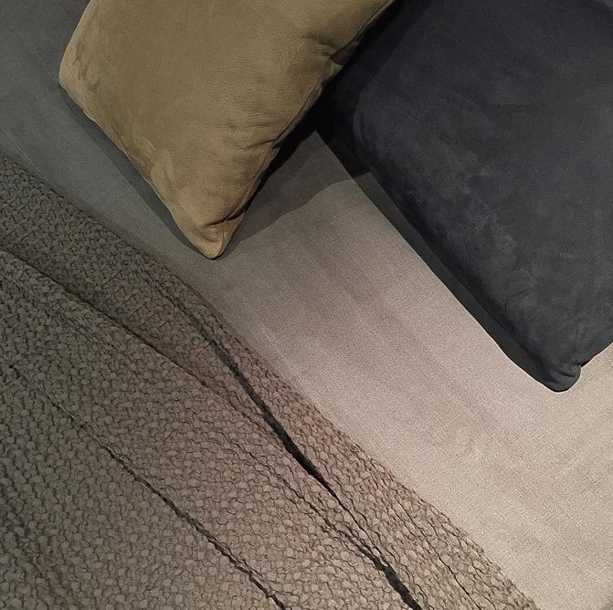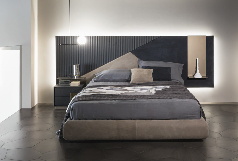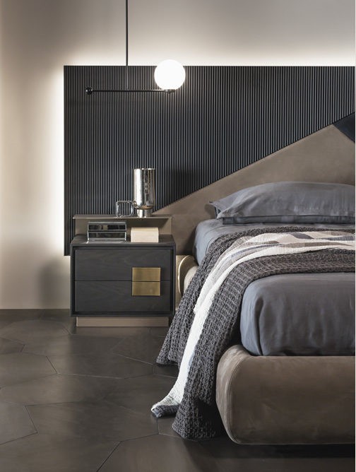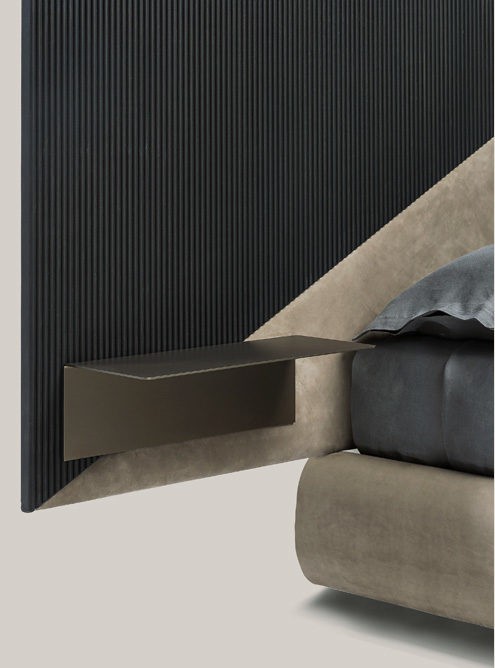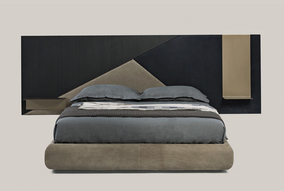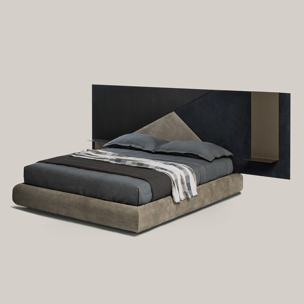 base with leather P20 nabuk liscio col. seppia, headboard with wooden parts T150 noir, leather P20 nabuk liscio col. seppia and P46 nabuk liscio col. blu oceano, light bronze metal shelves