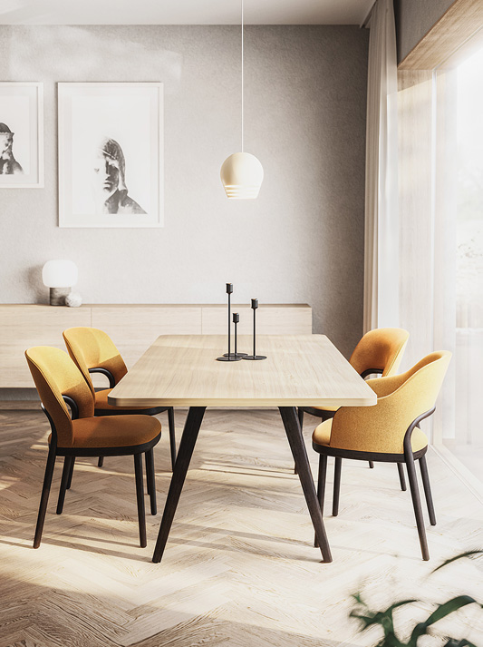 With its various versions, the 520 by Marco Dessí is the perfect chair, and not just for dining tables: sitting comfort comes together with a visual and physical lightness. It has a confident elegance that carries the culture and history of the classic Thonet bentwood chair within. In his design, Dessí replaced the empty spaces between the bentwood elements with comfortable upholstery. The simple, intelligent construction allows for a variety of versions, with or without armrests. Combined with a large selection of cover materials, the chair range is suitable for a wide range of uses, from sophisticated dining to executive meetings.