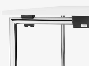 A lightweight folding table that does not reveal this practical characteristic at first glance. It has clear, minimalist aesthetics and a high quality in its materials and processing. It is mainly used in the training and seminar segments, but it is also suitable for flexible solutions in conferencing and meeting rooms. Thanks to small rollers and a pair of legs, it can be quickly and easily set up by one person. Adjustable gliders in the second pair of legs allow the table to be optimally aligned. Its special features include the large amount of leg room due to the table legs being positioned at the ends of the tabletop, easy assembly and disassembly via a simple, stable folding mechanism and the space-saving storage, since the tables can be perfectly stacked horizontally or vertically with minimum space required when folded up. Matching carts with a push bracket are available for transport.