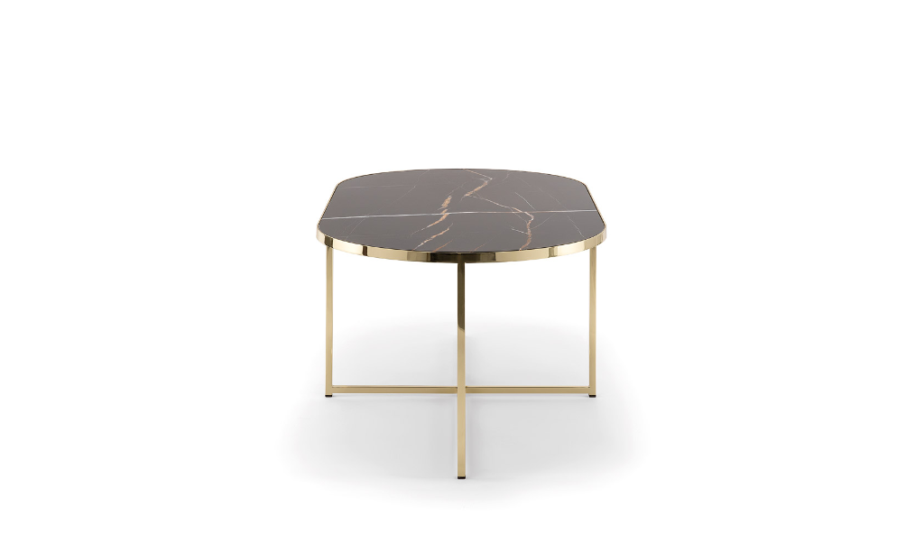 Collezione di tavoli in metallo, abbinati a piani in legno o marmo.