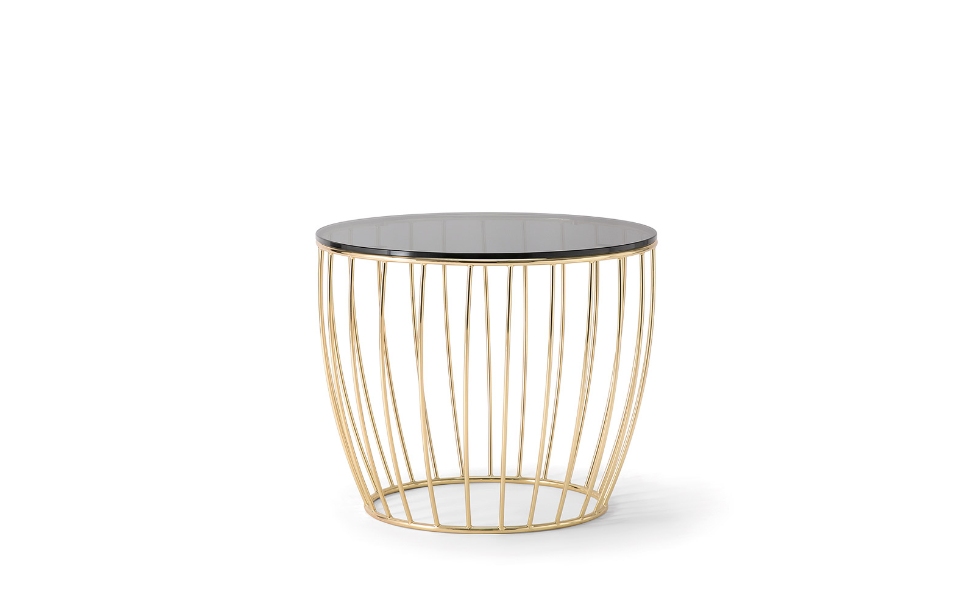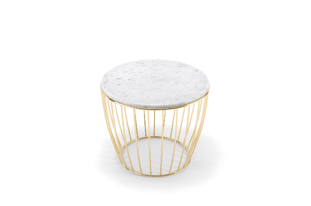 Collezione di tavoli in metallo, abbinati a piani in legno marmo o imbottiti.