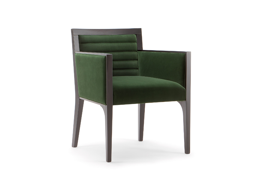 Memorie del 900 e rigore formale contemporaneo, convivono piacevolmentein un'ideale armonia fra il legno, il tessuto e il metallo.La poltrona Ginevra rappresenta un'ottima soluzione per arredare coneleganza ristoranti e hotel. La cornice in legno massello, cosi come le gambe,racchiudono un sedile e uno schienale sapientemente imbottiti.Le diverse tinte del legno, abbinabili a raffinati tessuti, offrono la possibilitadi personalizzare i prodotti e creare match perfetti per ogni spazio.
