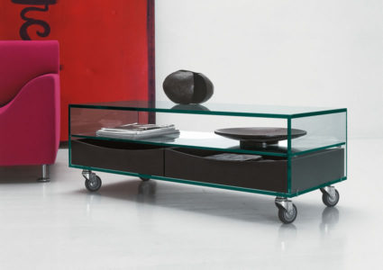 A unit to solve all space problems, thanks to its roomy drawers. Drawers available in: natural cherry wood, wengé, bleached oak, and natural or black leather, or lacquered in any colour of the RAL range.