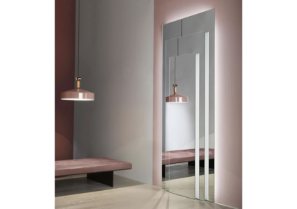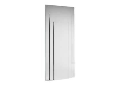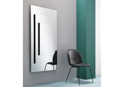 Wall mirror made of three juxtaposing glass panes. The panes are supported and kept apart by a wooden structure available in white or black.