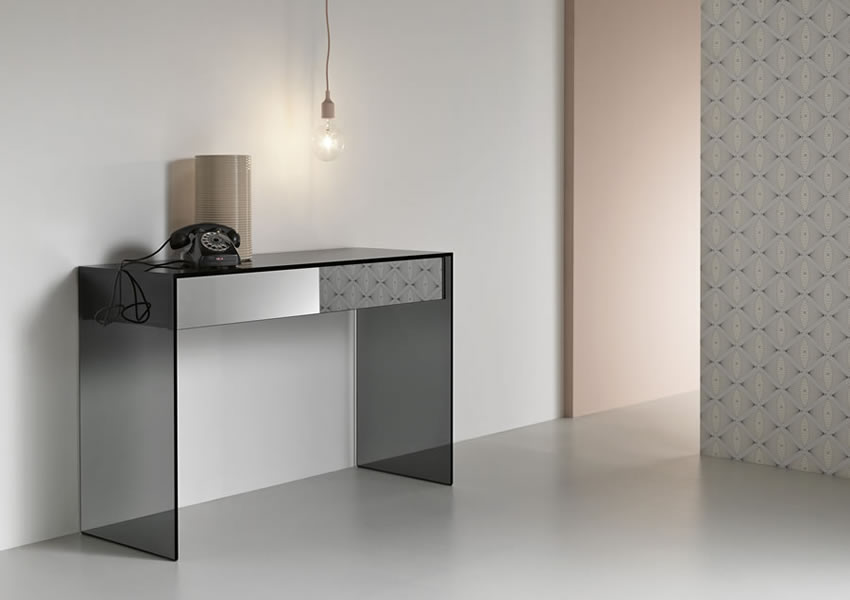 The Gotham table collection, with its simple form, is made of a console, coffee table and side table. The distinguishing mark is the smoked glass used for the external frame of each product. This recurring feature creates a strong complementarity between Gotham’s elements and enriches them of refined details, such as the “see, don’t see” effect of the internal black wooden drawers, equipped with soft closure and smoked mirror front.