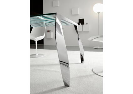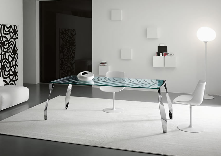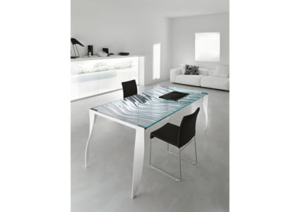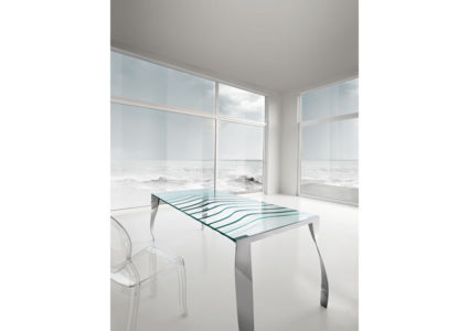 High table, with a glass top unique of its kind. The particular manufacturing creates a tridimensional effect on the glass surface. Available in transparent or extraclear glass. Metal chromed legs or white lacquered.