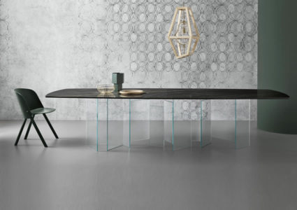 The table tops placed on the bases are in the 3 new polished finishes in ceramic+glass with marble effect.