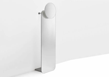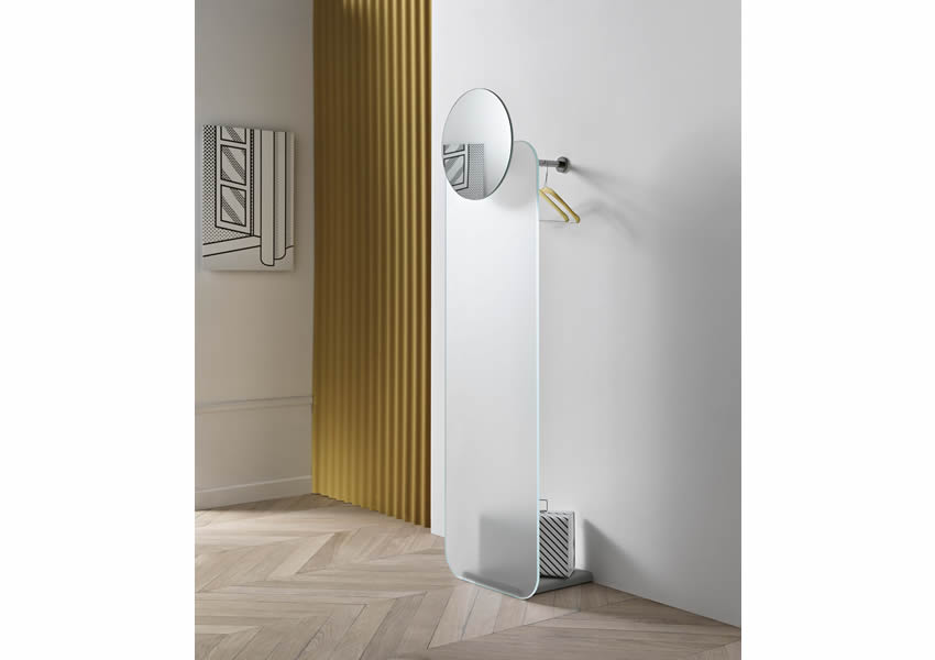 Coat hanger, framework to be fixed to the wall, made of a frosted or mirrored glass panel allowing a peek a boo of the clothing. A small round mirror is put on the upper part.