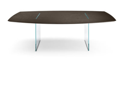 Magically suspended the top in canaletto walnut or wengé, sustained and crossed by two vertical glass panels.