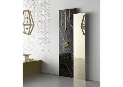 Wall mirror made of two internally inclined panes, one in marble effect ceramic Noir Desir, arabesque Calacatta, Orobico grey and rimmed by a solid wooden walnut canaletto frame, one in mirror, available in different finishes.