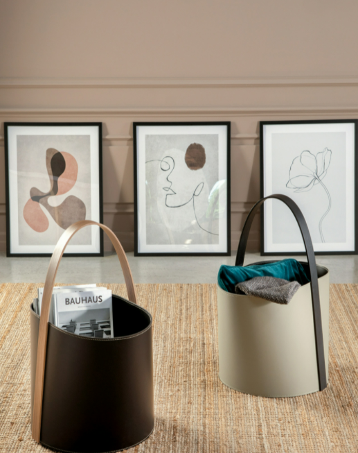 Materiali di alta qualità e artigianato più pregiato si uniscono nei cesti in cuoio Madame, impreziositi da un ampio manico lavorato a mano in legno termocurvato e disponibili in calde tonalità.