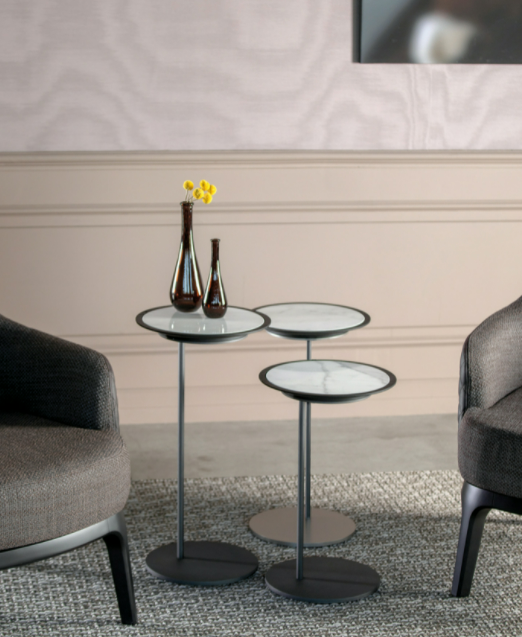 Come la madia già presente nella collezione, Dot è disponibile anche nella versione tavolino minimal chic che prende posto in ambienti senza tempo. Il top rotondo è caratterizzato dal gres porcellanato con una cornice in legno. La struttura in metallo verniciato rende questi tavolini essenziali e di grande valore estetico.