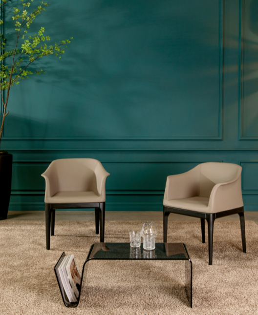 Una linea continua che disegna un tavolino lineare e un funzionale portariviste di design in vetro extrachiaro o fumè.