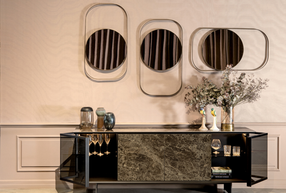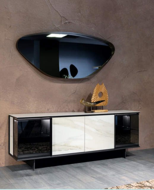 La parola Aira deriva dall’arabo e significa “splendente”, aggettivo che ben si addice alla raffinata eleganza di questa madia che, con ante in gres e dotata di led interno, è in grado di far brillare qualsiasi spazio abitativo. L’inedita apertura laterale delle due vetrine ai fianchi della madia conferisce un’identità precisa al suo esclusivo design.