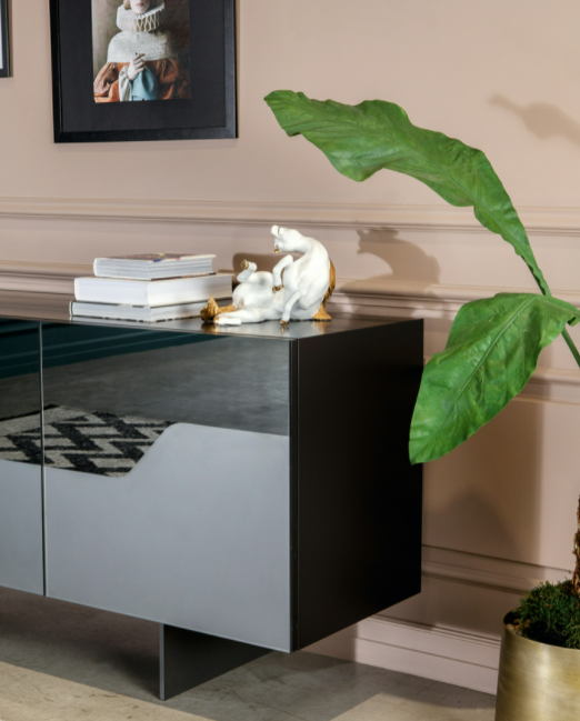 Un elemento iconico, con struttura portante in legno laccato nero e base in metallo verniciato, le ante in vetro tono bronzo o fumè sono impreziosite con inserto in gres porcellanato dalle venature calde che accarezzano la superficie della madia, sollecitano al tatto e sprigionano luce e energia. Disponibile in varie finiture.
