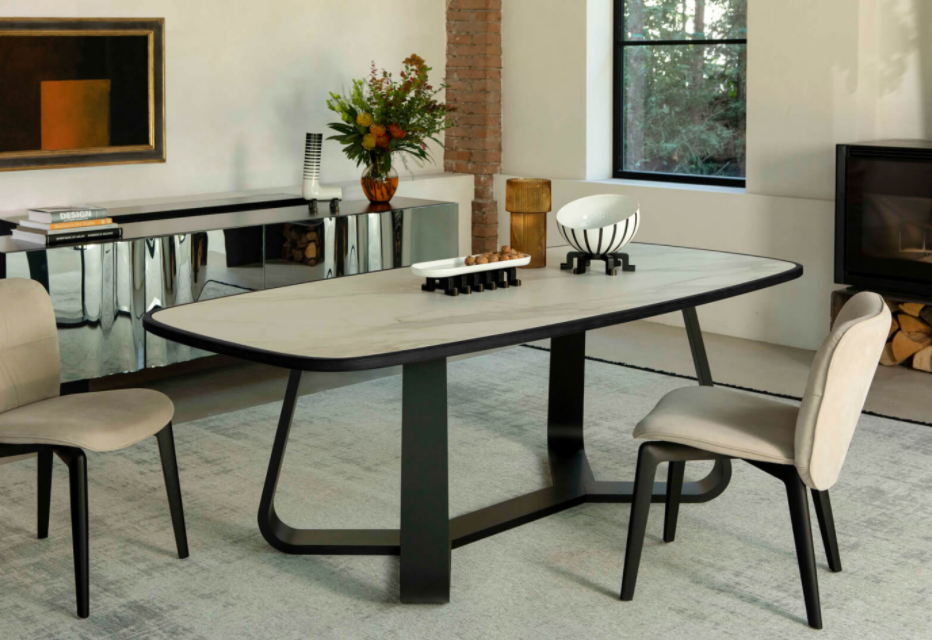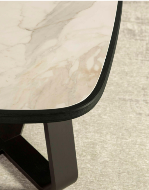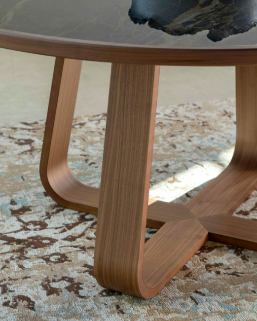 Il fascino elegante di Branch nasce dalla combinazione preziosa dei materiali pregiati che lo compongono: la struttura in legno termocurvato incontra il top in porcellana, impreziosito da una sinuosa cornice in legno massello.