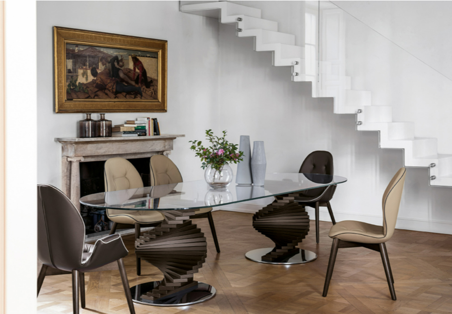 La caratteristica principale del tavolo Firenze è la base di listelli in legno massiccio noce canaletto, o rovere scuro. I listelli vengono accoppiati uno ad uno, per creare una scultura a spirale che crei un elegante effetto ottico. Un piano in vetro, o gres porcellanato, disponibile in più misure, chiude la struttura.
