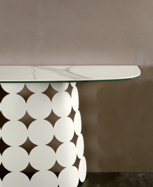 Il sapore ed il ricordo di una cornice d’altri tempi, creata grazie ad una tecnologia del tutto contemporanea, che rende il taglio della base di Pois una combinazione di arte e manifattura. Il metallo verniciato si apre nella fantasia di spazi aperti e chiusi, e sostiene perfettamente i piani in legno massello o grès porcellanato di un tavolo che vive da protagonista in ogni living.