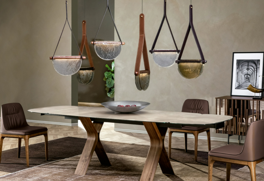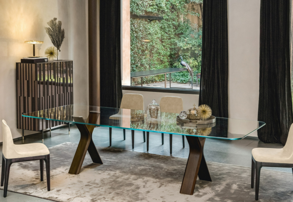 Tavolo fisso o allungabile con base in legno termocurvato, pensata per essere abbinata ad eleganti piani in vetro o gres porcellanato o vetroceramica. Le linee più semplici possono essere le più eleganti e senza tempo.