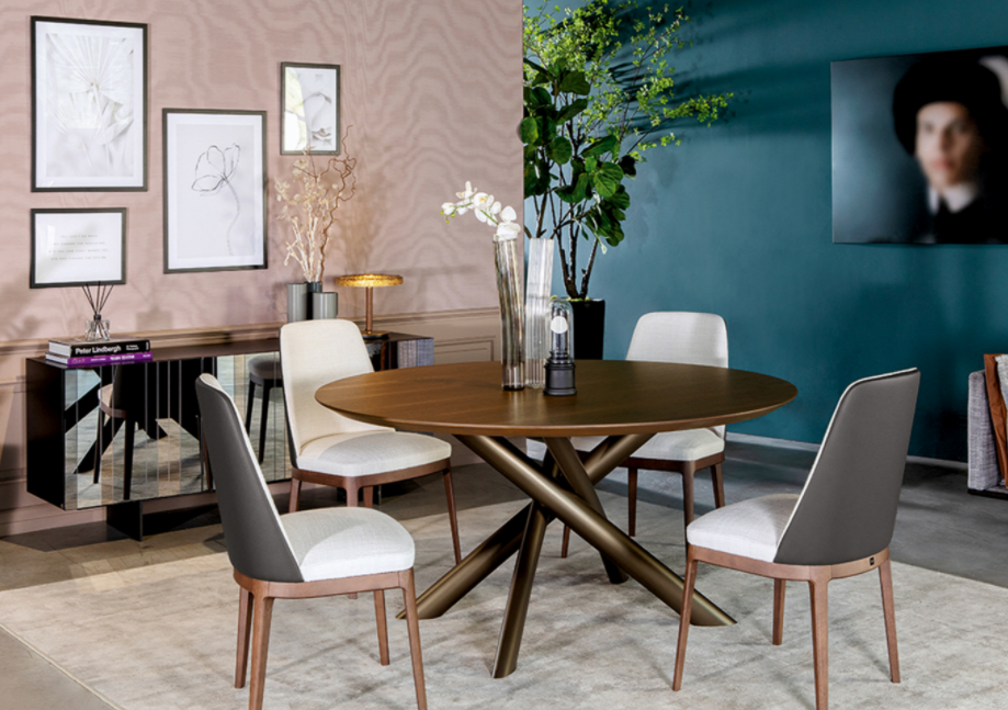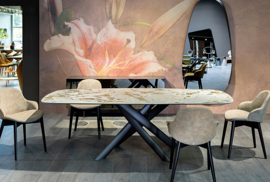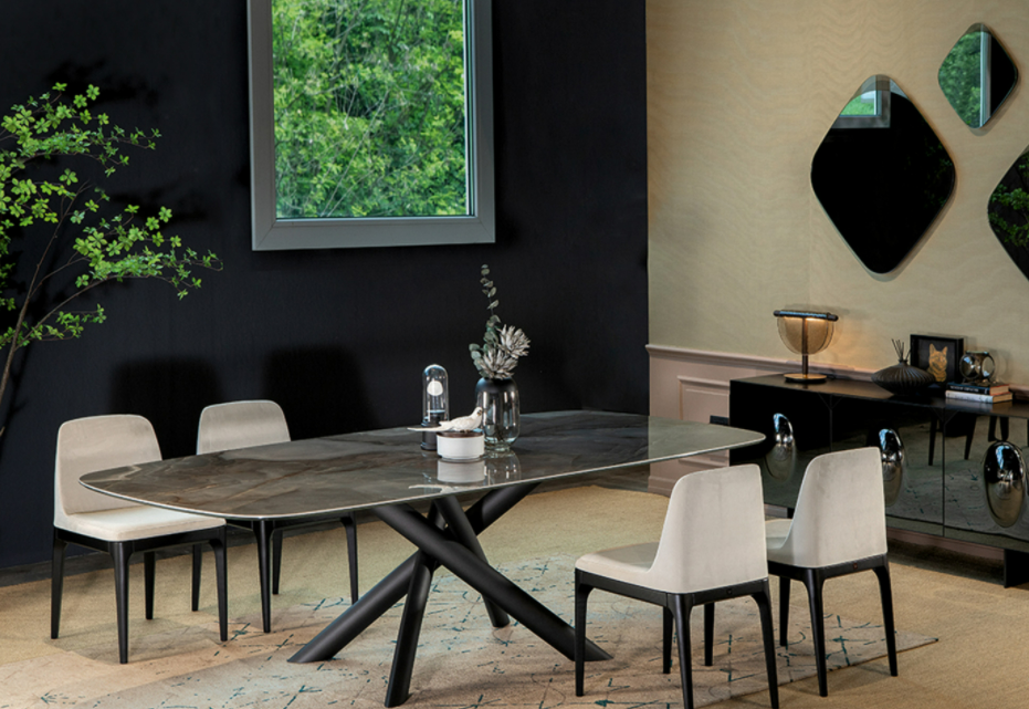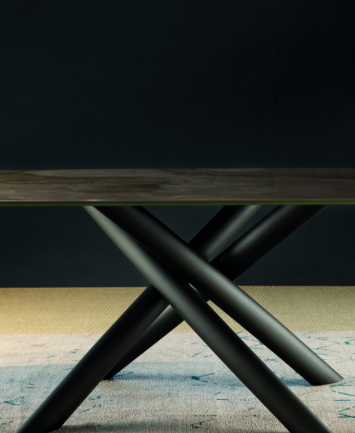 Lo stile è la peculiarità di questo nuovo ed esclusivo tavolo che si distingue per un’estetica articolata, un unicum che fonde le forme intrecciate della sontuosa base al raffinato design dei piani in gres porcellanato, vetro martellato e legno.
