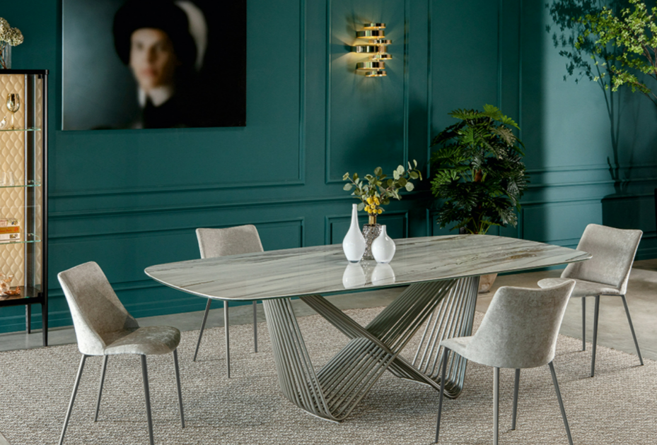 deciso, incontrando i vari top nelle diverse finiture della gamma Tonin Casa: vetro, porcellana, legno, marmo. Un tavolo dalla forte identità che si adatta perfettamente ad ogni stile di interni.