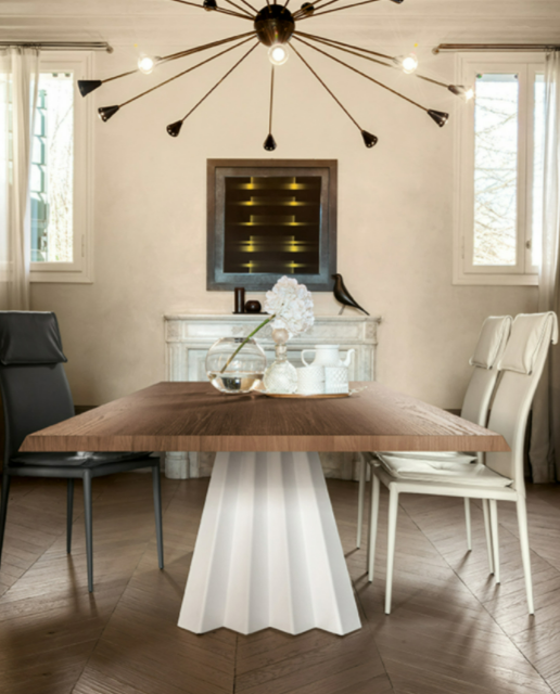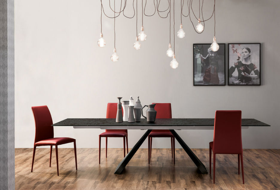 Concepito in Italia e composto di sole materie prime italiane, Ventaglio offre un connubio ideale di sapienza artigiana e qualità. La base del tavolo, e principale caratteristica di questo prodotto, è realizzata in metallo curvato e verniciato in diverse colorazioni. Il piano, allungabile o fisso, è disponibile in vetro, vetro ceramicato e legno. L’eleganza del design si rivela al suo massimo, nella versione allungabile in legno.