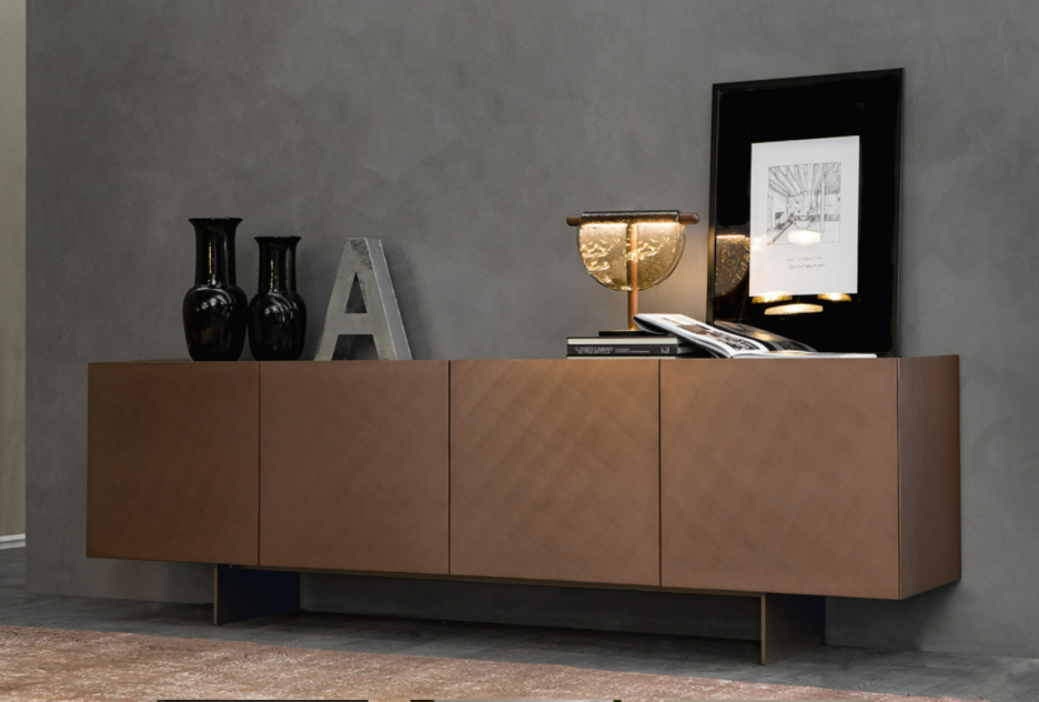 Una credenza con lavorazione spazzolata disponibile nella versione bronzata, rame o titanio. Una texture semplice ma di effetto per abbinare le madie alle basi dei nostri tavoli.