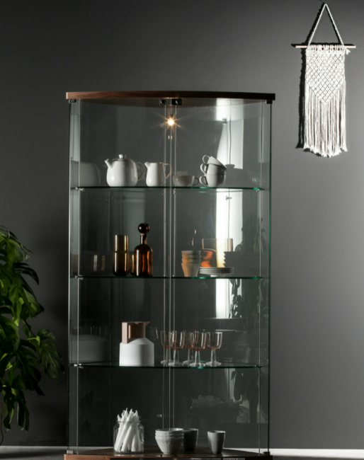Una vetrina dalle forme morbide e semplici, la cui curvatura è perfetta per evidenziare la preziosità del contenuto. Il legno sorregge e ispessisce base e top, mentre del morbido vetro curvato segue le linee di ante e schienale. Il faretto a LED integrato impreziosisce ulteriormente il tutto.