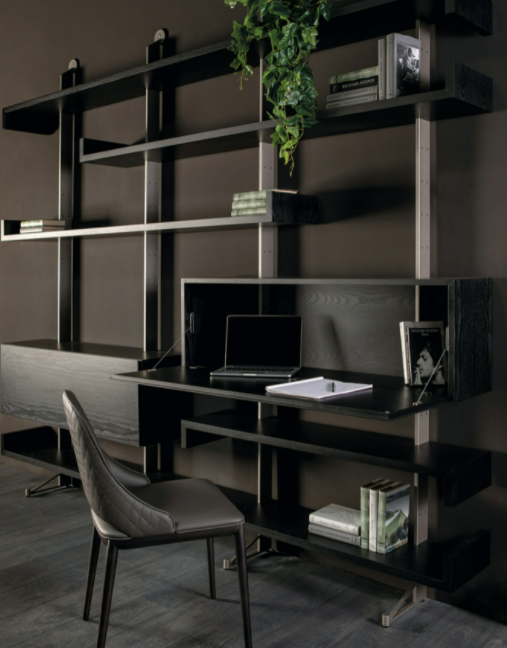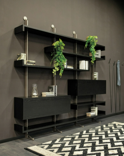 Questa libreria è composta da una serie di mensole che creano movimento, interrompendo la continuità della parete. Oltre ai ripiani, si possono aggiungere anche dei cassettoni di varie dimensioni, così da avere più spazio contenitivo